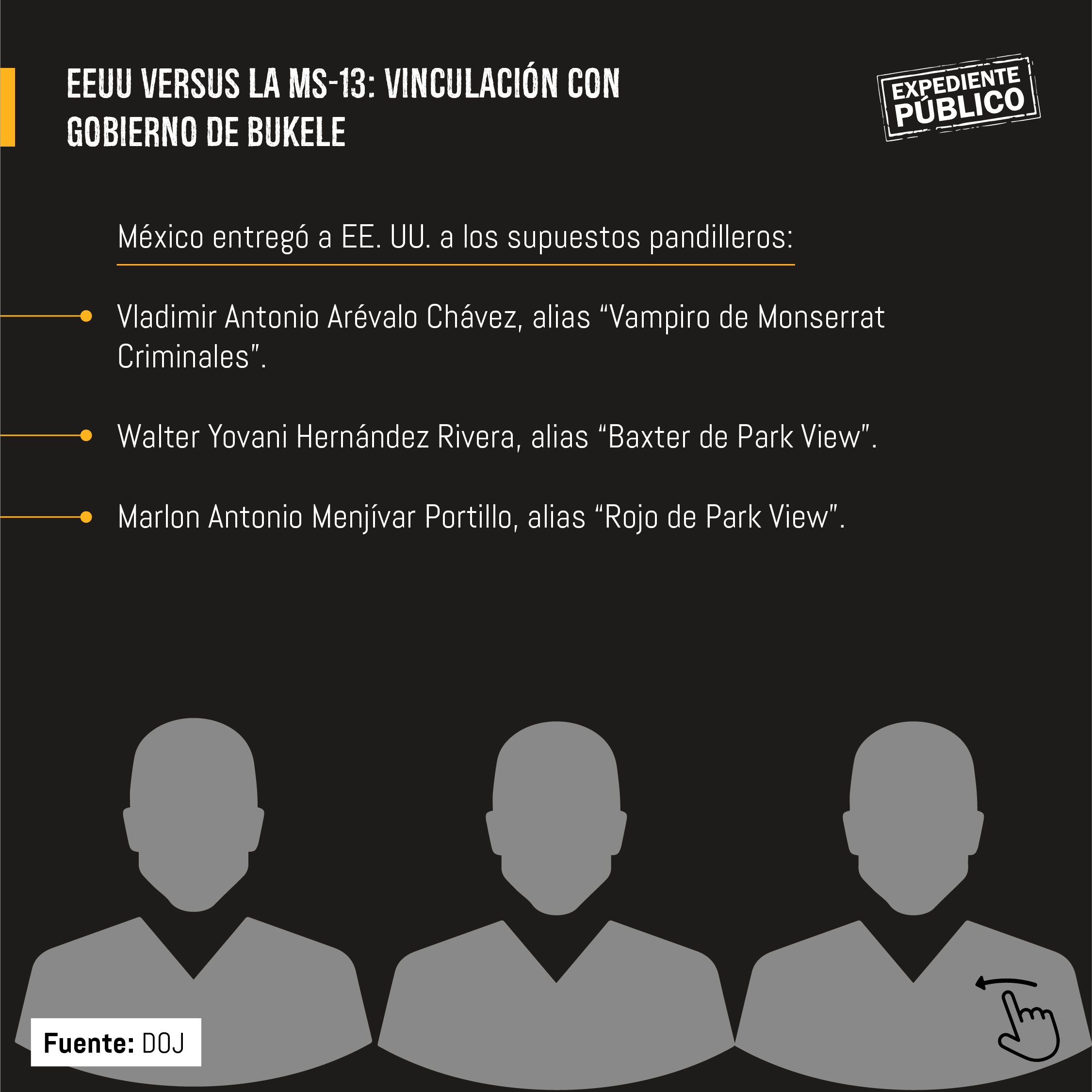 Los tres acusados detenidos en Houston, Texas, luego que México los identificó y entregó a EE. UU., responden a los nombres de Vladimir Antonio Arévalo Chávez, alias “Vampiro de Monserrat Criminales”; Walter Yovani Hernández Rivera, alias “Baxter de Park View”, y Marlon Antonio Menjívar Portillo, alias “Rojo de Park View”.