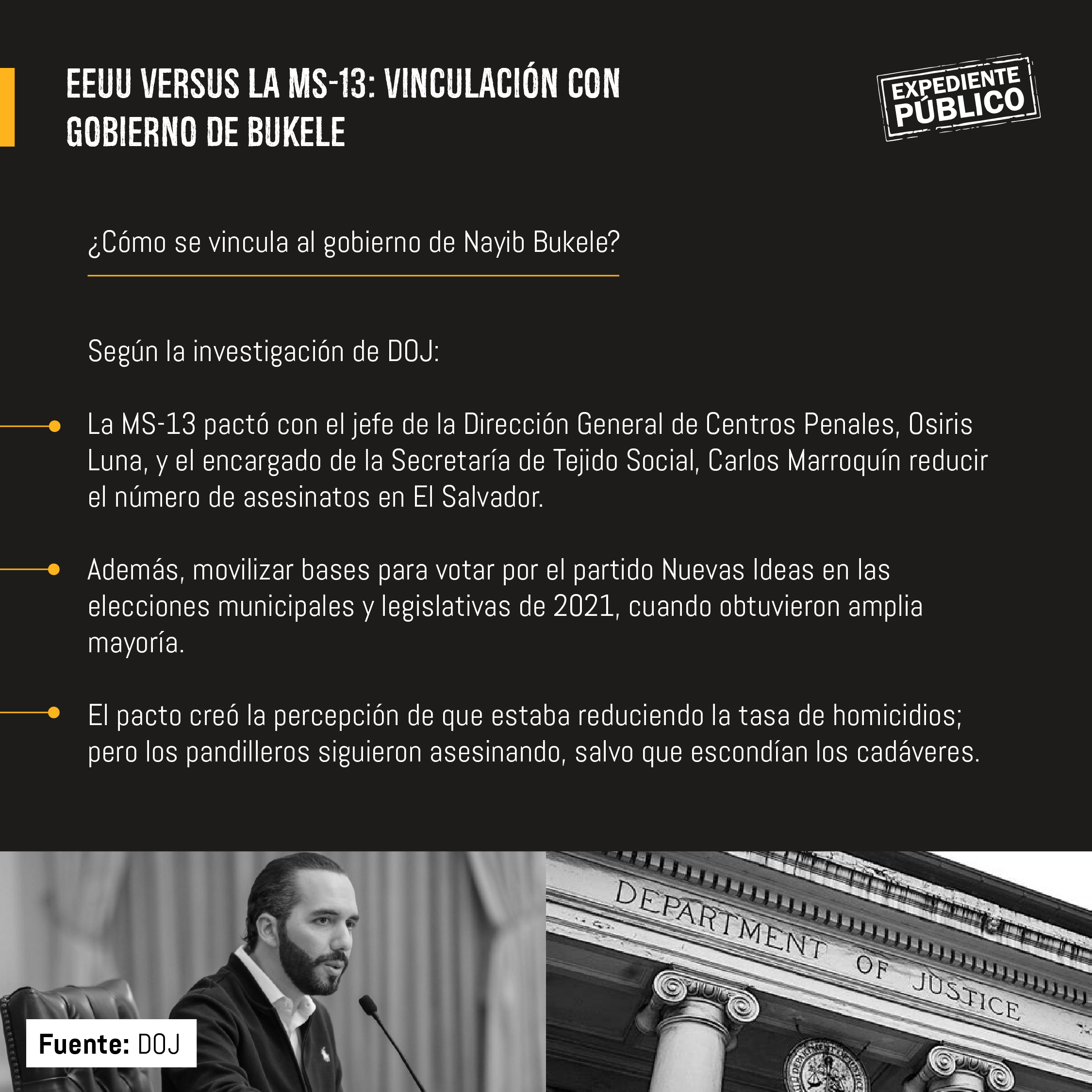 Expediente Público accedió a la acusación CR 22429 de la Corte neoyorquina donde se establece que, en este nuevo pacto, los mandos negociaron el apoyo electoral a favor del partido gobernante Nuevas Ideas (NI) en 2021 con el compromiso de que el Gobierno salvadoreño no extraditara a los criminales reclamados por EE. UU.