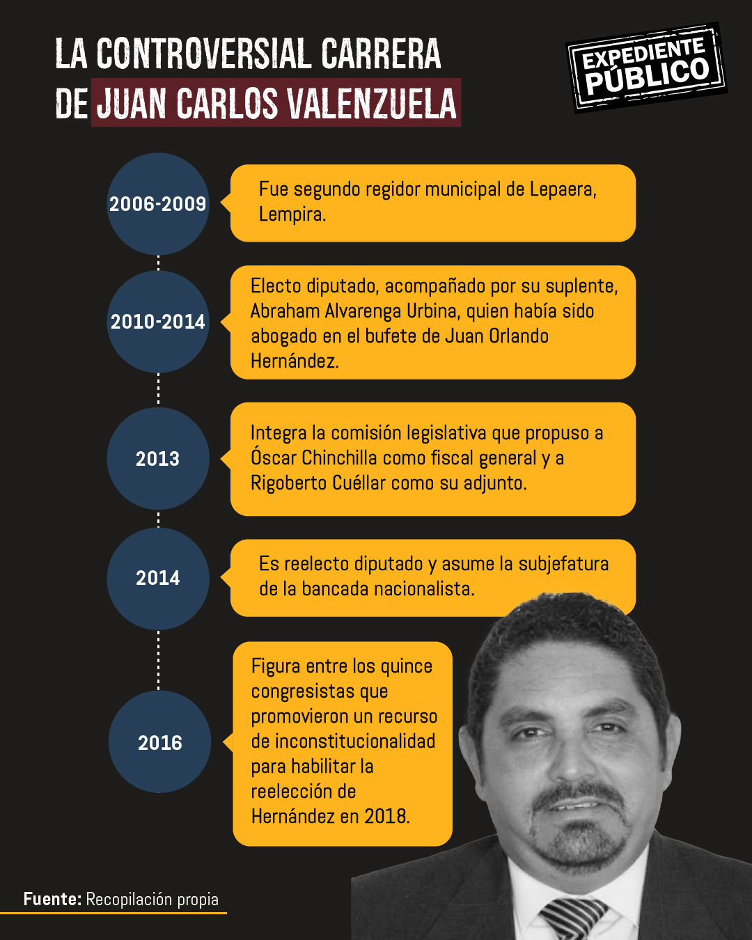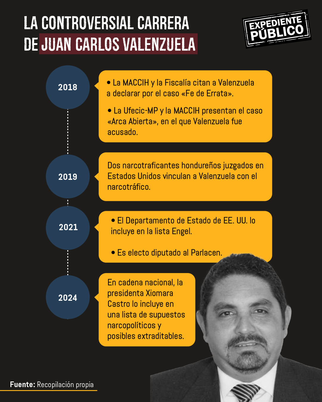 Estas acusaciones desde Estados Unidos aparecieron meses antes de las elecciones generales de 2021, en las que Valenzuela fue electo diputado al Parlacen. Tras asumir el cargo, prácticamente desapareció del escenario público hasta septiembre de 2024, cuando la presidenta Xiomara Castro lo señaló en cadena nacional de radio y televisión, incluyéndolo en una lista de supuestos casos de narcopolíticos y posibles extraditables.
