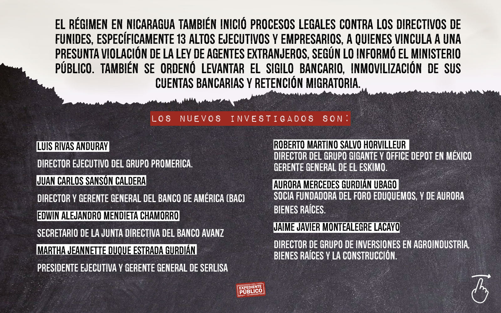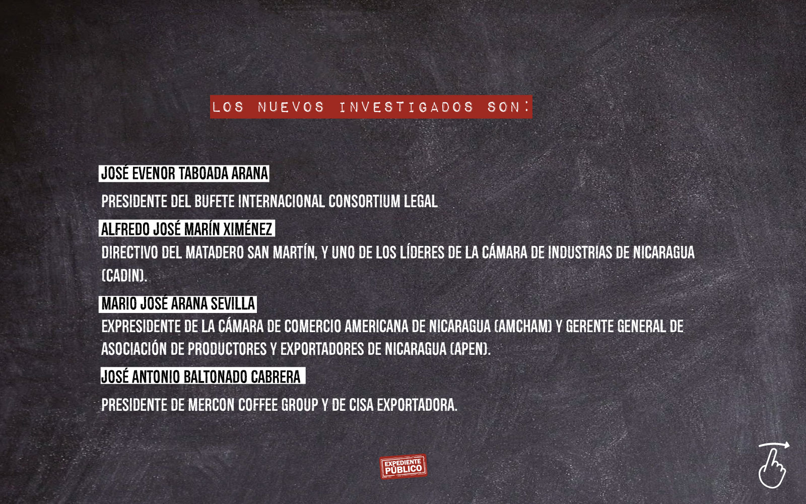 Son cinco precandidatos presidenciales opositores detenidos, a cuatro ya los jueces les han impuesto 90 días de prisión por estar investigados, con la «Ley de los Pueblos», por supuesta «traición» por gestionar sanciones internacionales contra el régimen y funcionarios de Ortega.