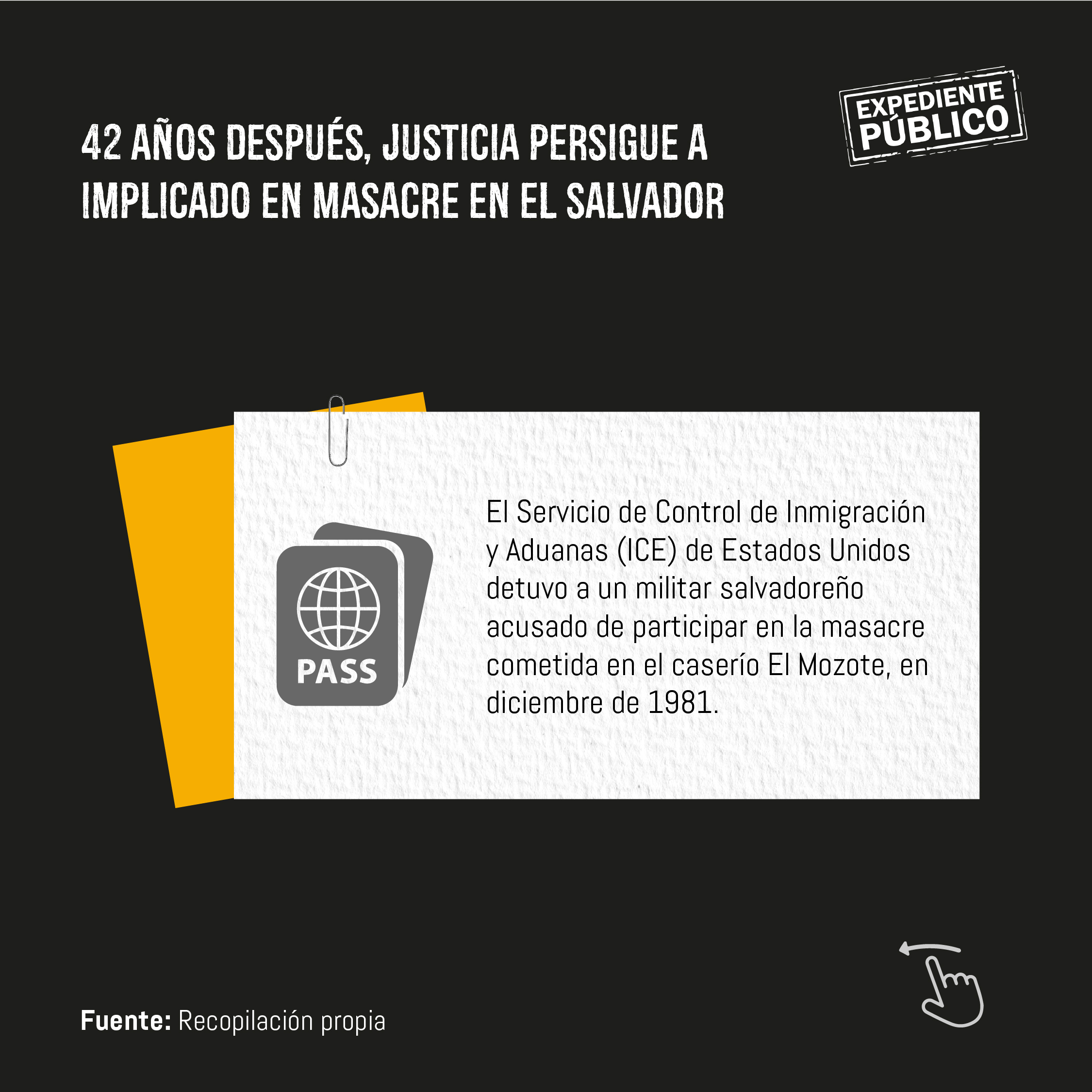 * El Servicio de Control de Inmigración y Aduanas (ICE, por sus siglas en inglés) de Estados Unidos detuvo a un veterano del Ejército salvadoreño acusado de participar en la masacre El Mozote, cometida en diciembre de 1981.