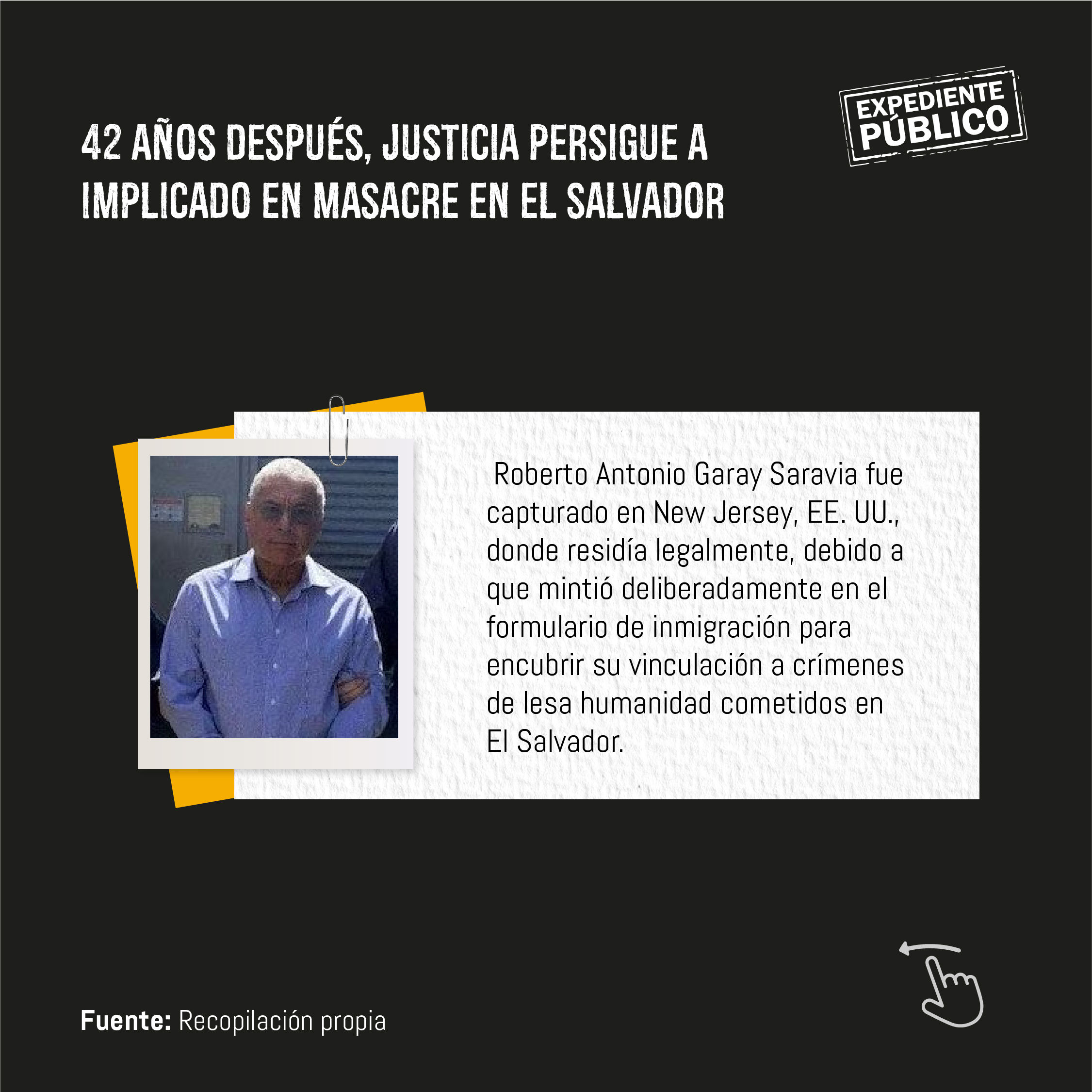 * Roberto Antonio Garay Saravia fue capturado en New Jersey, EE. UU., donde residía legalmente, debido a que mintió deliberadamente en el formulario de inmigración para encubrir su vinculación con crímenes de lesa humanidad.