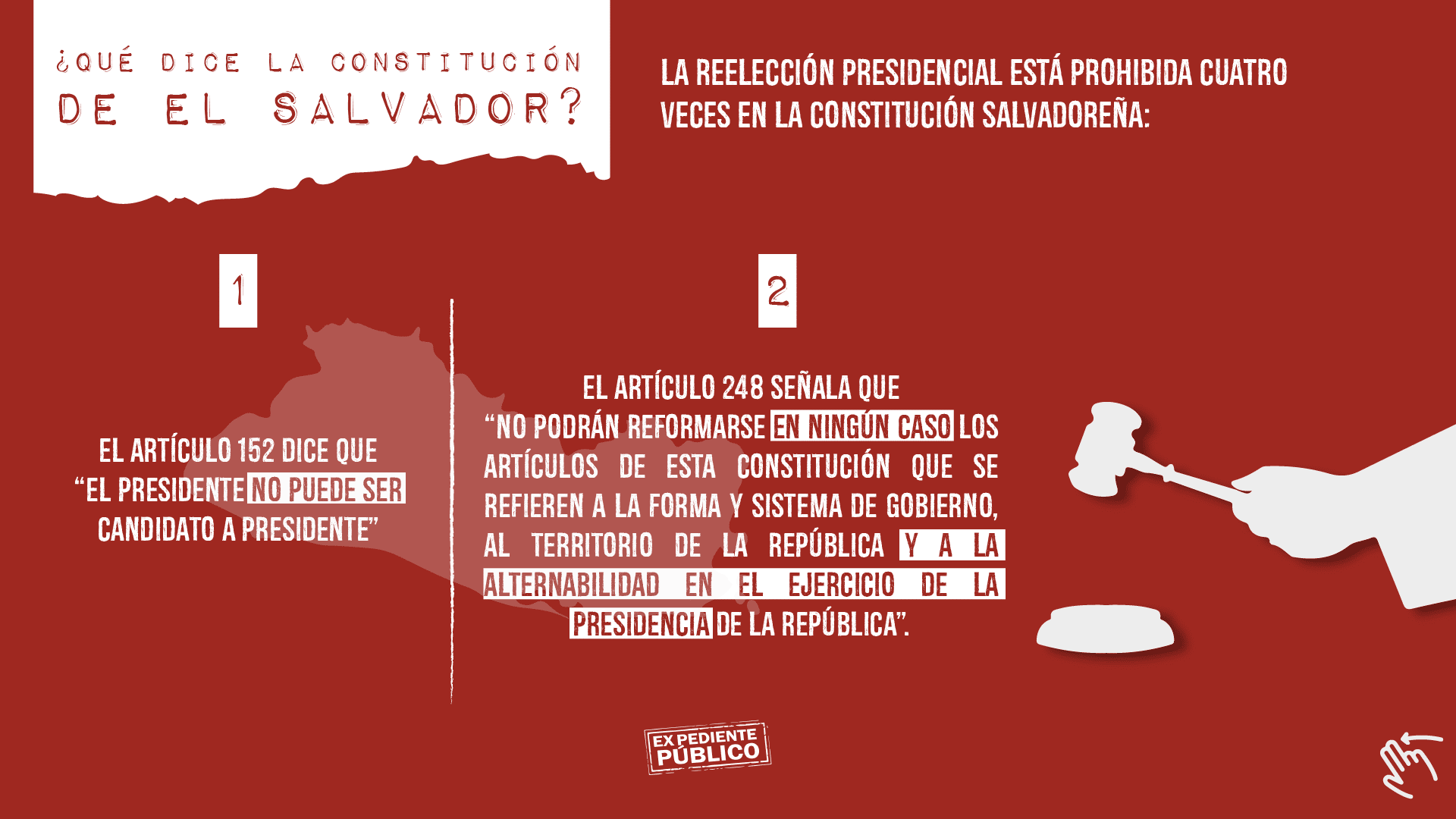 *Cuatro artículos de la Constitución salvadoreña prohíben expresamente la reelección presidencial, pero la Sala de lo Constitucional impuesta por el oficialismo, hace una interpretación y le permite a Nayib Bukele reelegirse en 2024.