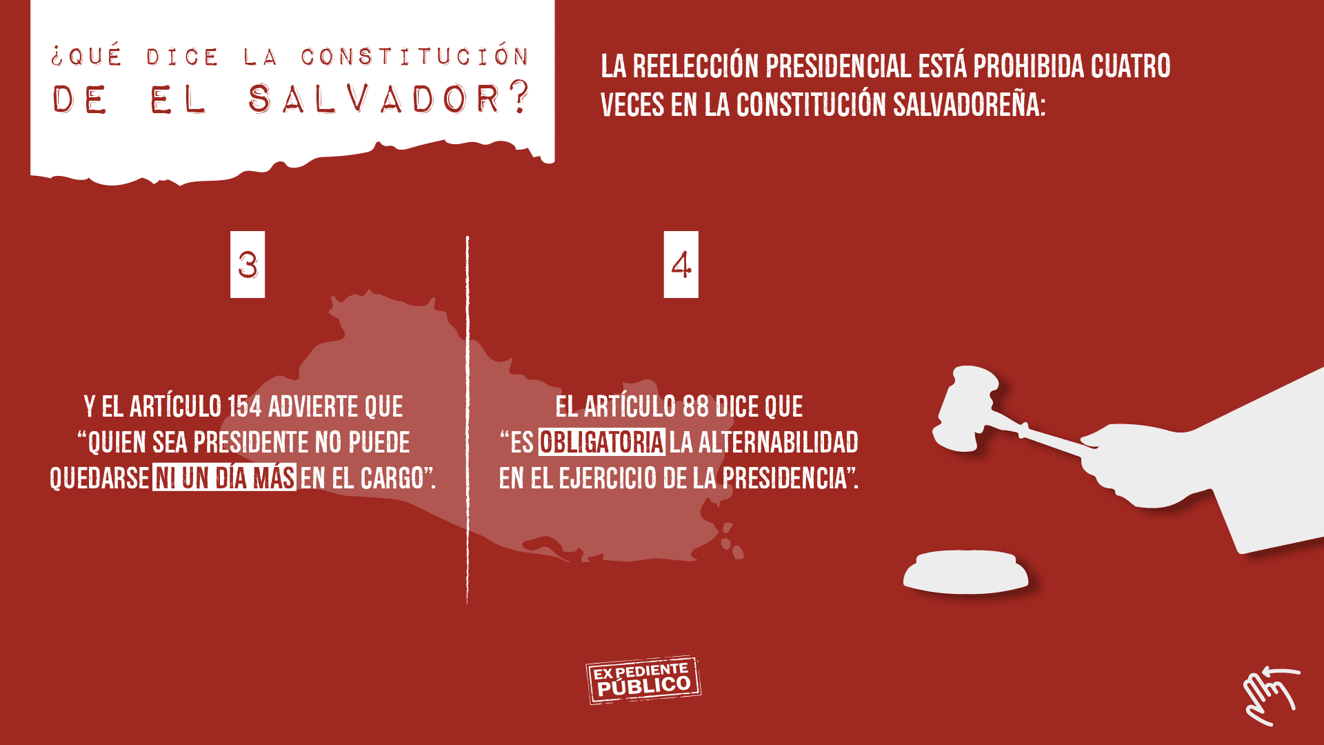 La reelección presidencial está expresamente prohibida en cuatro artículos de la Constitución salvadoreña y desde el derrocamiento del dictador militar, Maximiliano Hernández Martínez en 1944, ningún mandatario se atrevió a desafiar esas limitaciones.