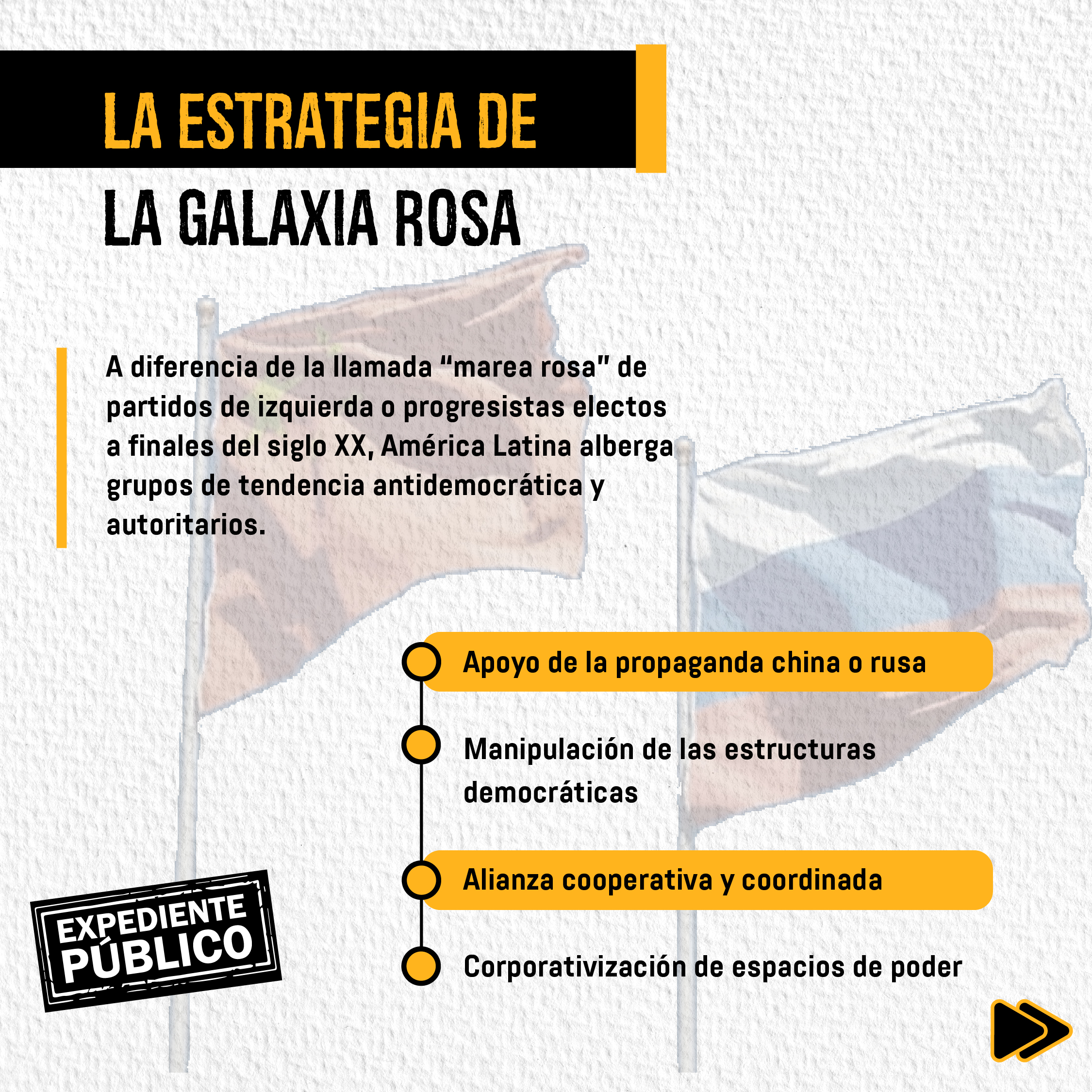 Grundberger apoda “galaxia rosa” a la izquierda regional por el concepto de los años 90 de “marea rosa” cuando partidos llamados progresistas ganaron diferentes elecciones, pero también, porque se trata de una amplia serie de organizaciones y redes, aunque con una veintena de líderes siempre presentes.