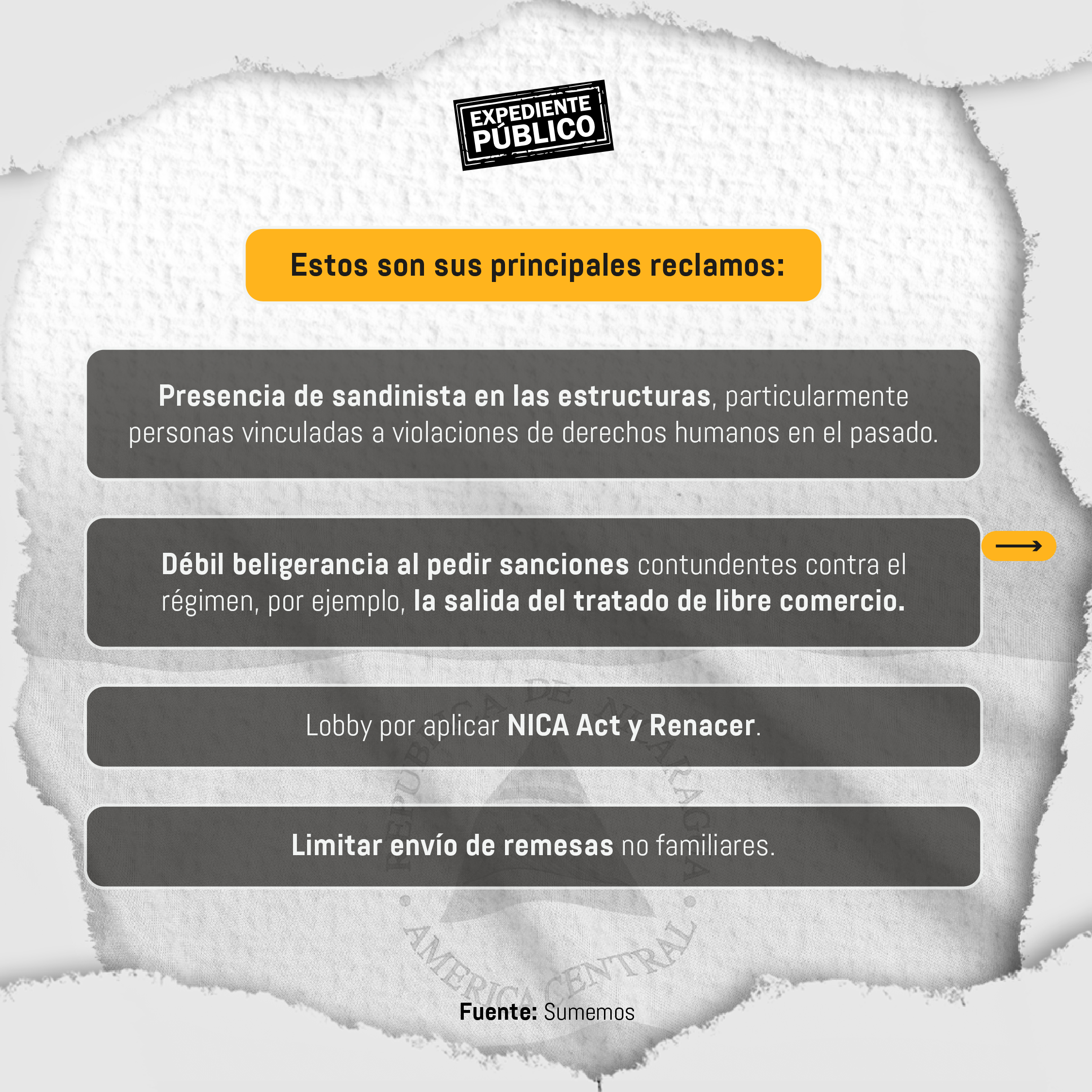 Del mismo modo piden aplicar el marco legal Renacer, NICA Act y la ley Magnitsky, un bloqueo financiero de las multilaterales y limitar el envío de las remesas.