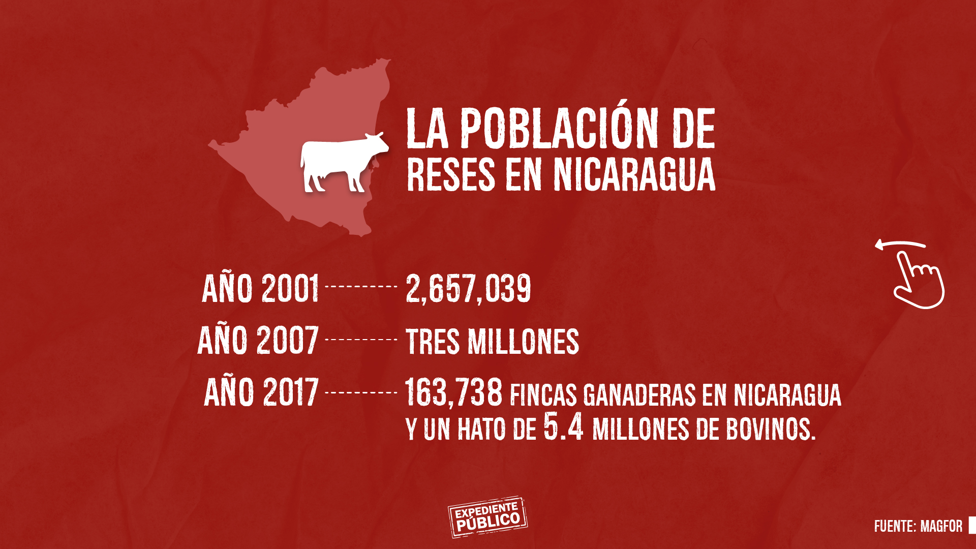 La población de reses en Nicaragua en 2001 era de 2,657,039, en 2007 se calculaban tres millones y para 2017 había 163 mil 738 fincas ganaderas en Nicaragua y un hato de 5.4 millones de bovinos, según el Ministerio de Agricultura y Ganadería.