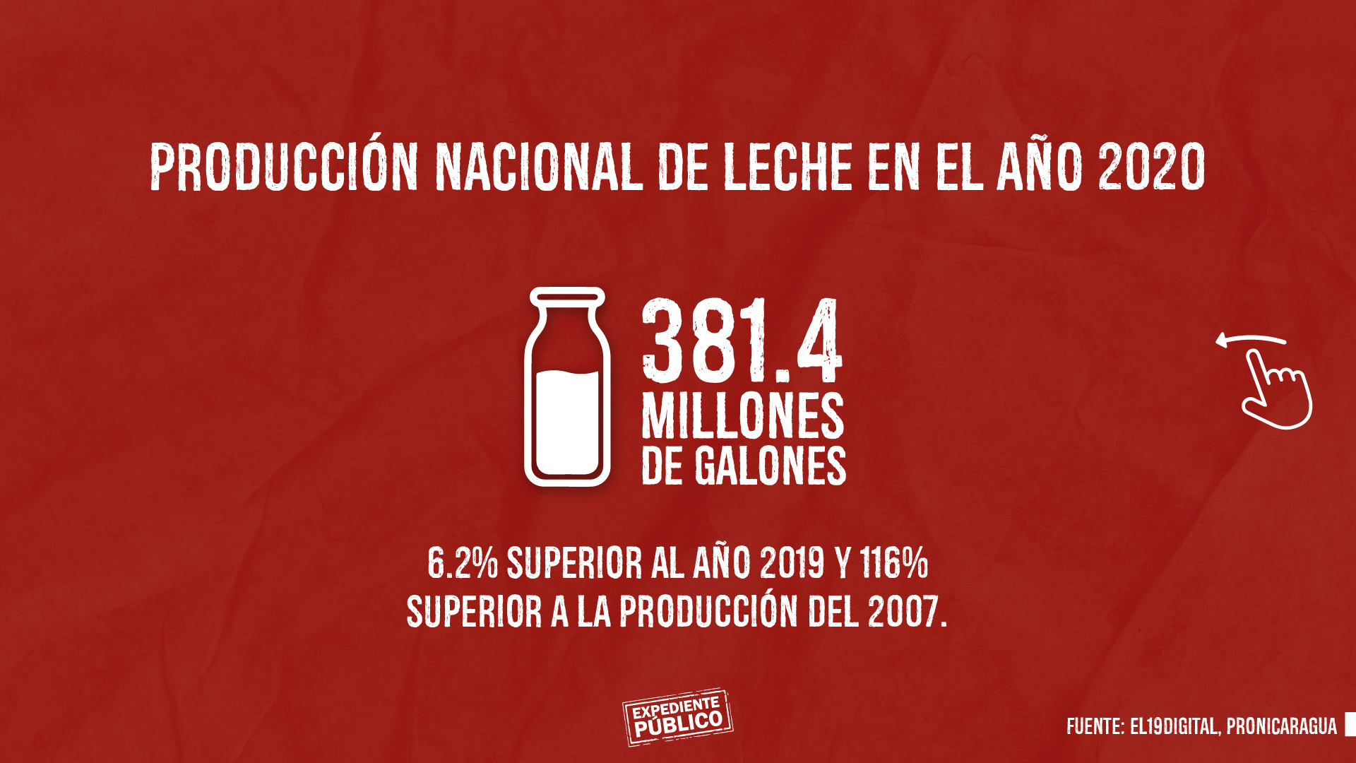 La producción nacional de leche en el año 2020 fue de 381.4 millones de galones, 6.2% superior al año 2019 y 116% superior a la producción del 2007. Según la Comisión Nacional Ganadera (Conagan) a diario se producen 3.6 millones de litros de leche, además, asumen, que existen 60 mil kilómetros cuadrados de tierras para uso agropecuarios, contando con casi 24 mil kilómetros cuadrados de pastos naturales, y más de 9 mil de pastos cultivados a nivel nacional.