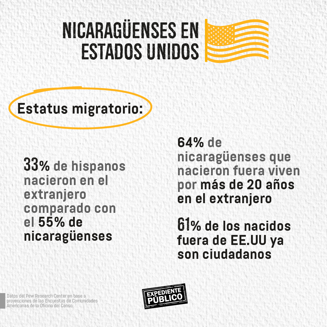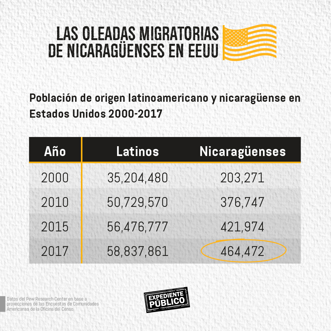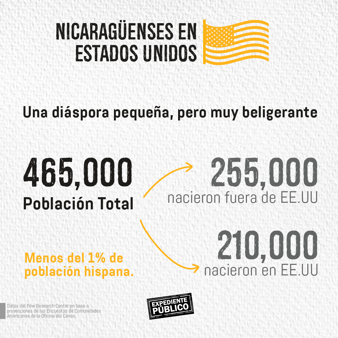 La cifra sobrepasa la capacidad de apoyo de la diáspora asentada en Estados Unidos, que hasta 2017 representaba menos del 1% de la comunidad latina. Entonces, unas 464,000 personas se identificaban a sí mismas como “nicas”, aunque el 45% de ellos habían nacido en territorio estadounidense, según datos del Pew Research Center en base a proyecciones de las Encuestas de Comunidades Americanas de la Oficina del Censo.