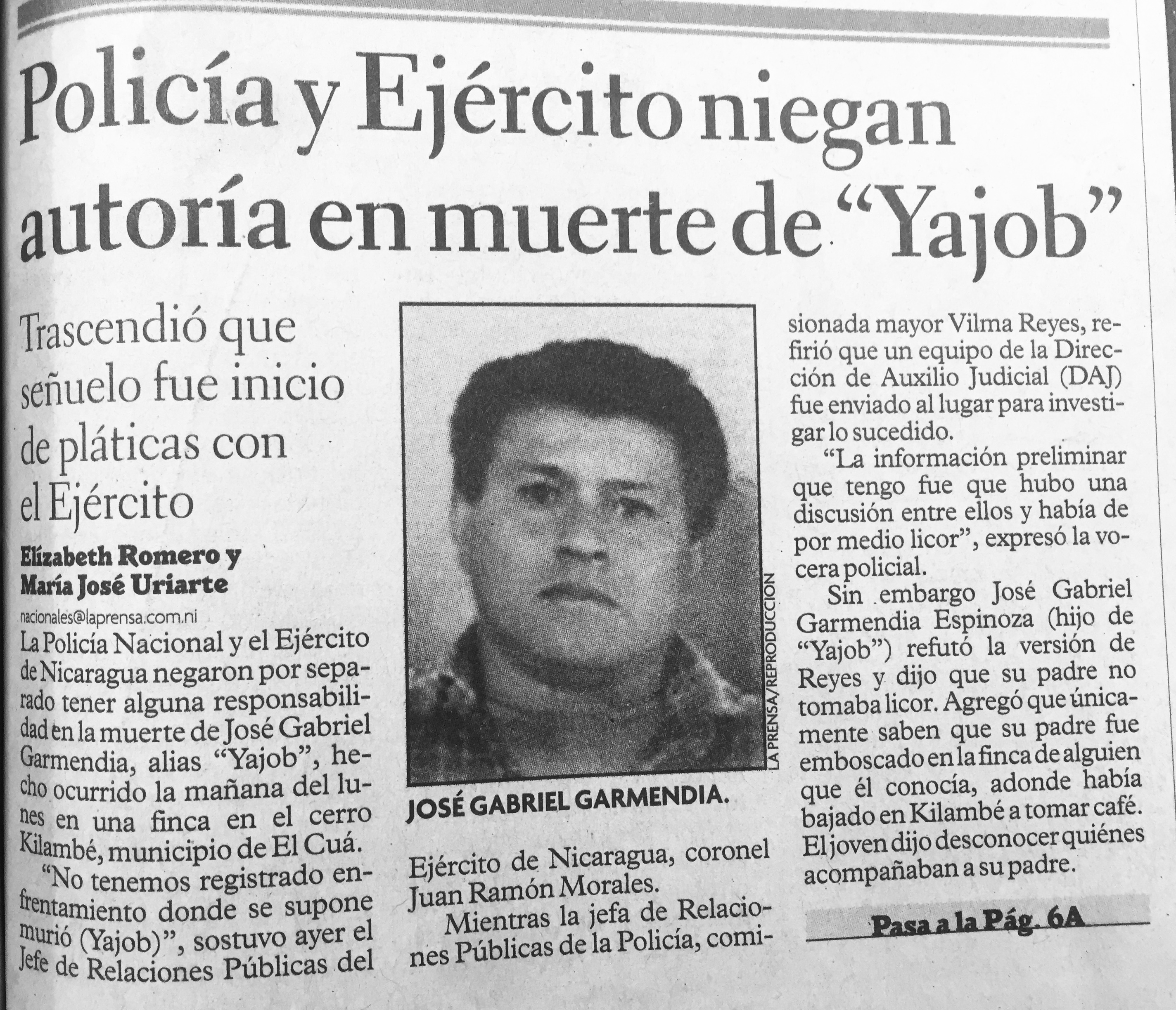 El Centro Nicaragüense de Derechos Humanos (Cenih) ha documentado el asesinato de 22 personas, entre 2007 y 2011, en operaciones militares de fuerzas gubernamentales. De esas, diez eran personas rearmadas, las demás eran acompañantes o estaban vinculadas a los primeros. Entre esos diez rearmados está José Gabriel Garmendia, alias Yahob.
