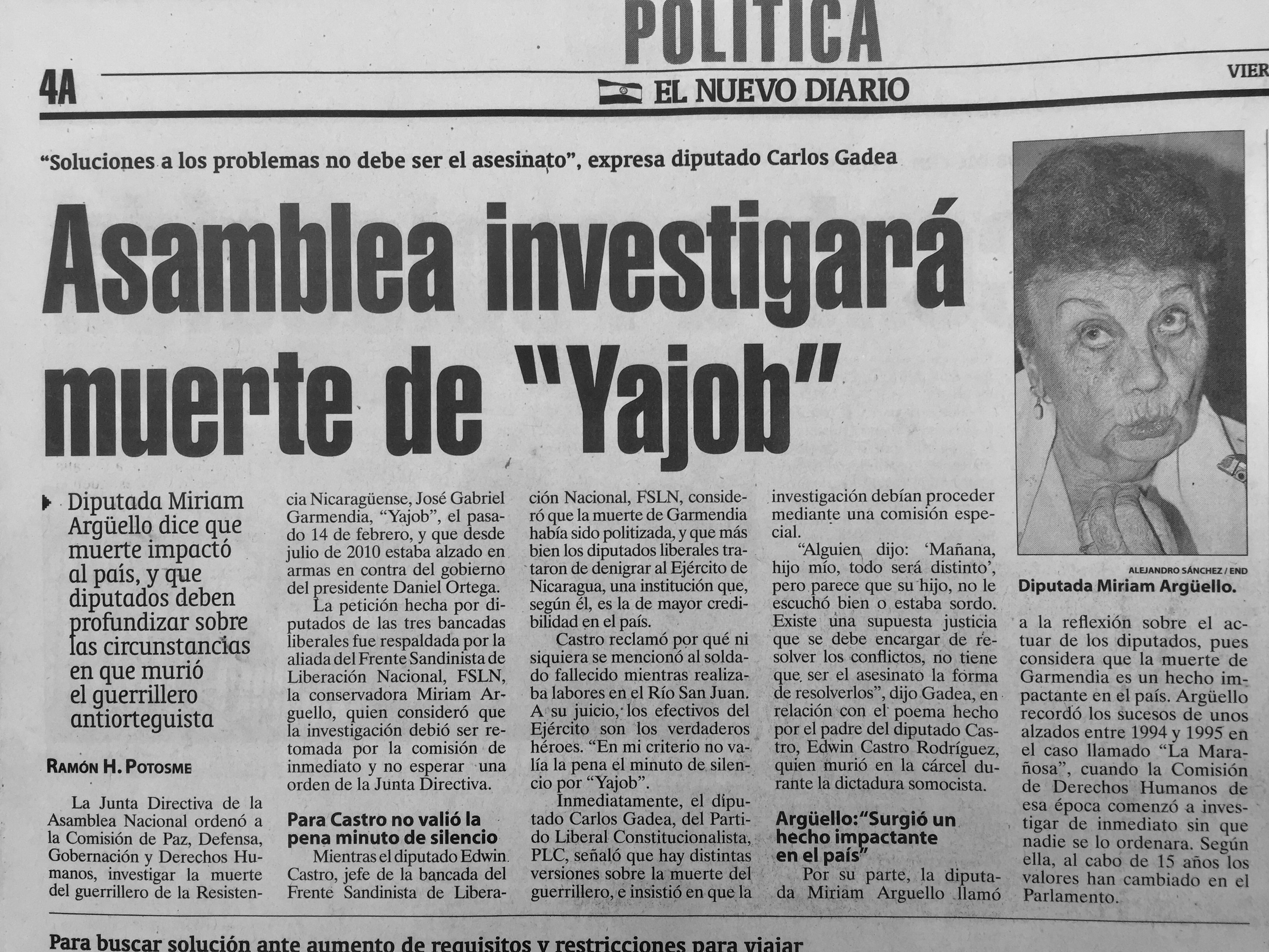 El Gobierno de Nicaragua, de la gestión de Ortega, nunca aceptó que Garmendia era un opositor armado. En julio de 2010, medios de comunicación, como el Nuevo Diario, publicaron declaraciones del director del Ejército Nacional, Julio César Avilez, en las que señalaba que Yahob era un delincuente común con antecedentes penales y buscado por la justicia.