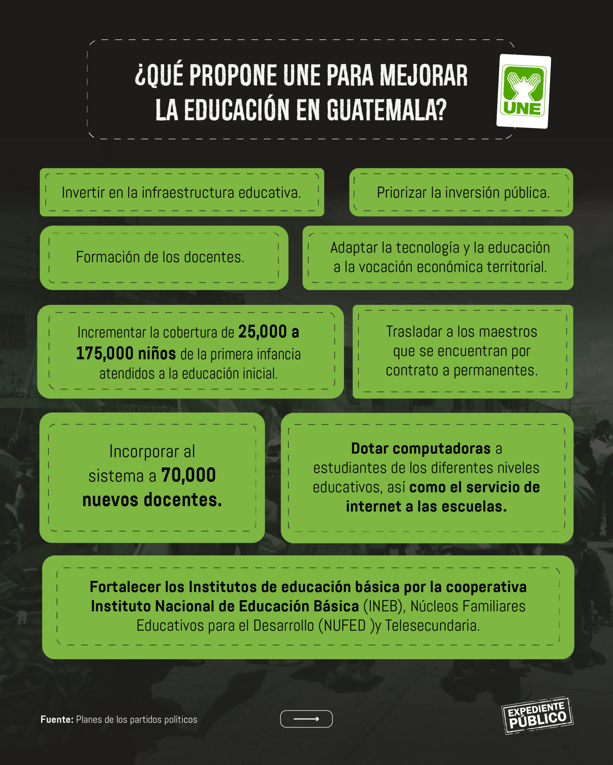 En el eje de educación los planes se diferencian en formas de ejecución. Semilla se enfoca en la creación de más infraestructura y UNE en los métodos educativos.