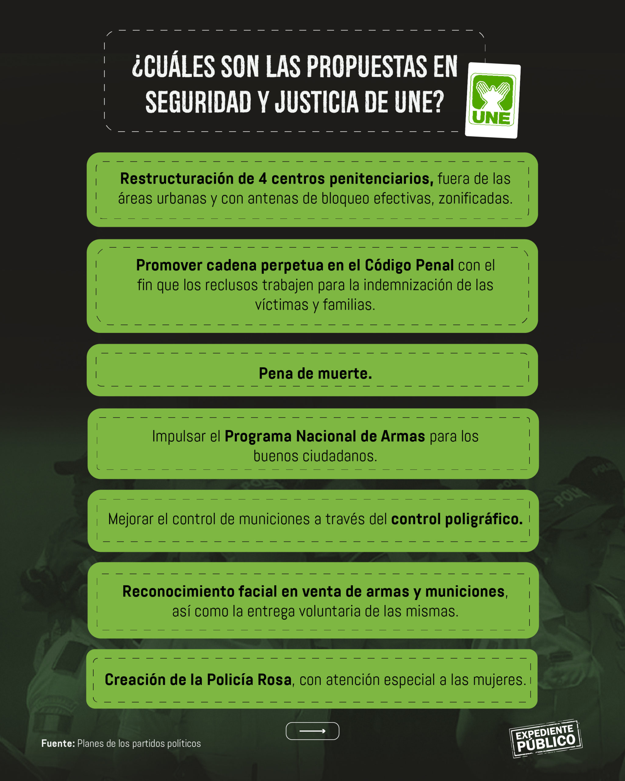 En el ámbito de seguridad y justicia, el plan de la UNE, presenta más de 200 propuestas, mientras que el de Semilla cuenta con cinco específicas.