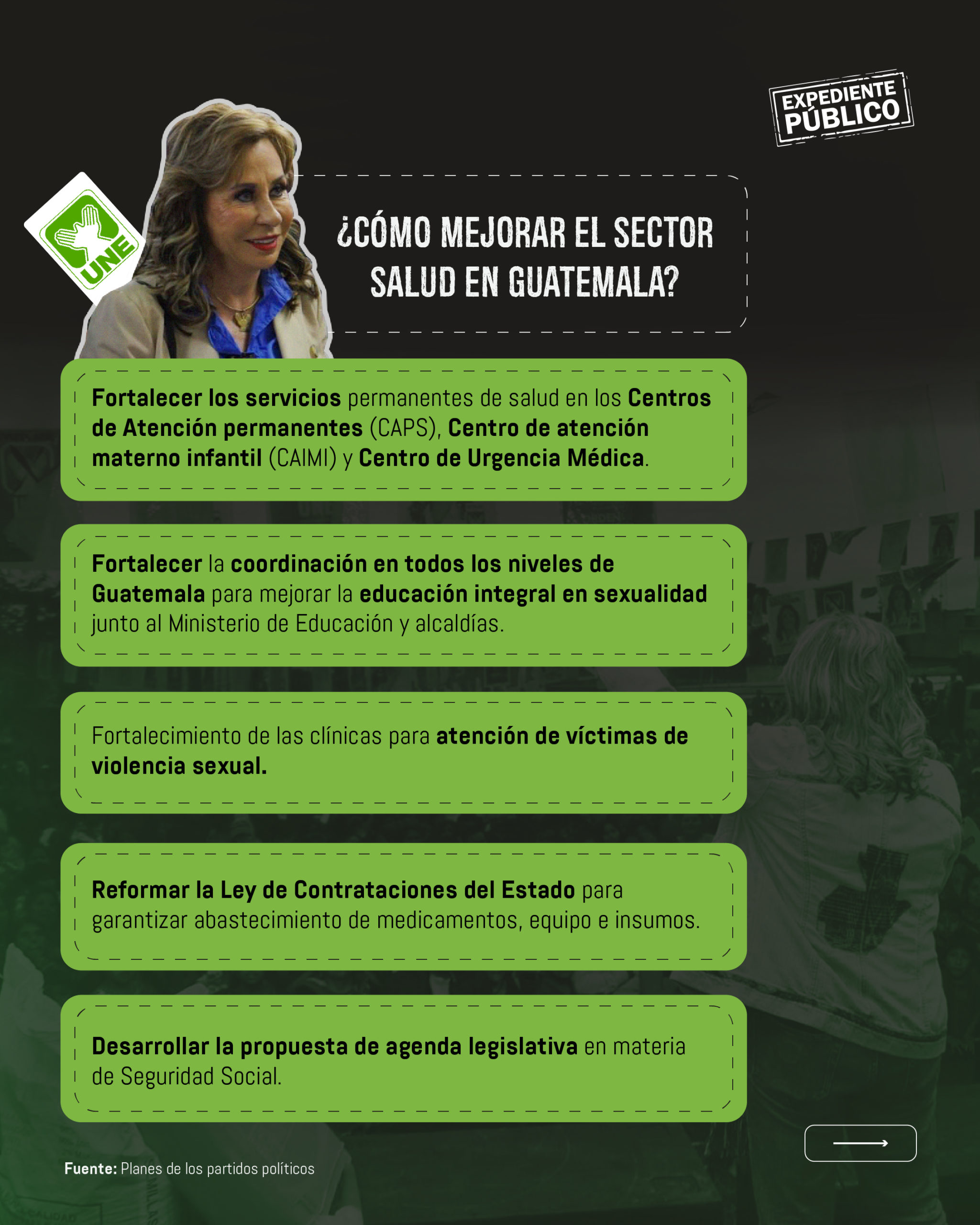 Respecto a las propuestas de UNE, el Dr. Herrera considera es necesario fortalecer los centros de salud, pero que al no especificar el cómo, se demuestra que no se tiene noción de la falta de personal médico, tanto doctores, como de enfermeras para dar cobertura a los guatemaltecos.