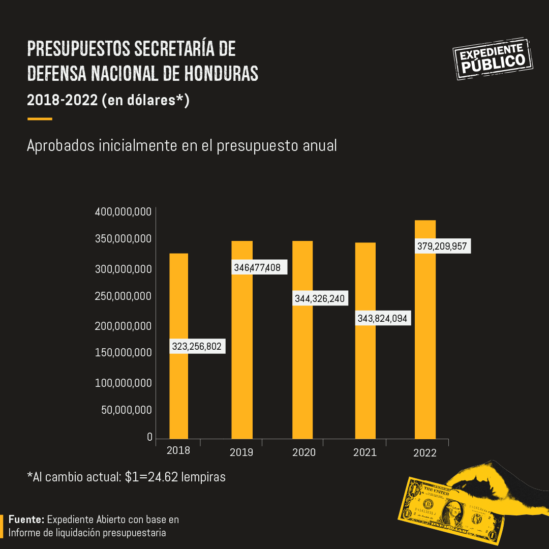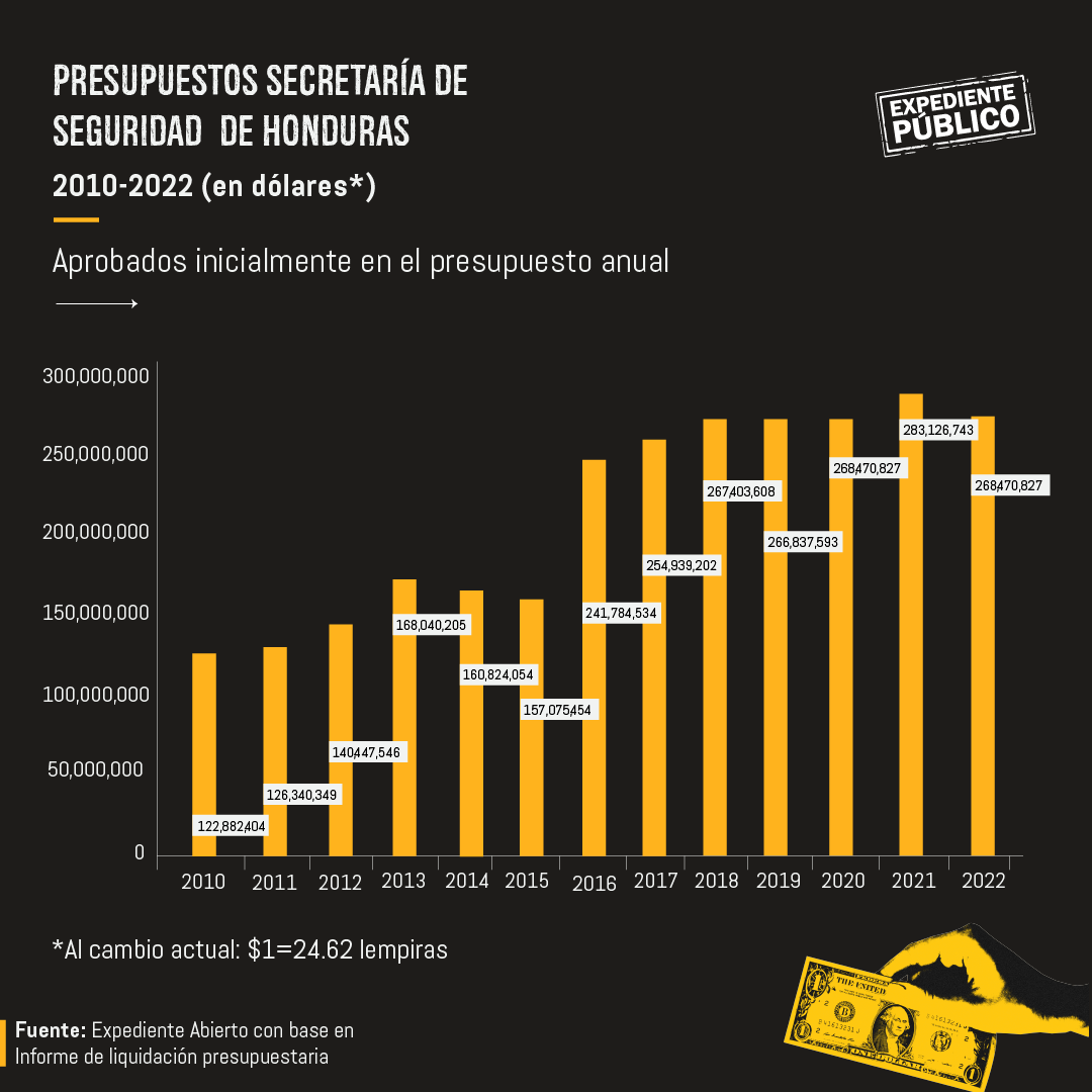 Según el centro de pensamiento Expediente Abierto, con base en informes de liquidación presupuestaria, el presupuesto de Seguridad pasó de 112.8 millones de dólares en 2010 a 268.4 millones de dólares en 2022. Mientras que el de Defensa, de 323.2 millones de dólares en 2018 a 379.2 millones de dólares en 2022.