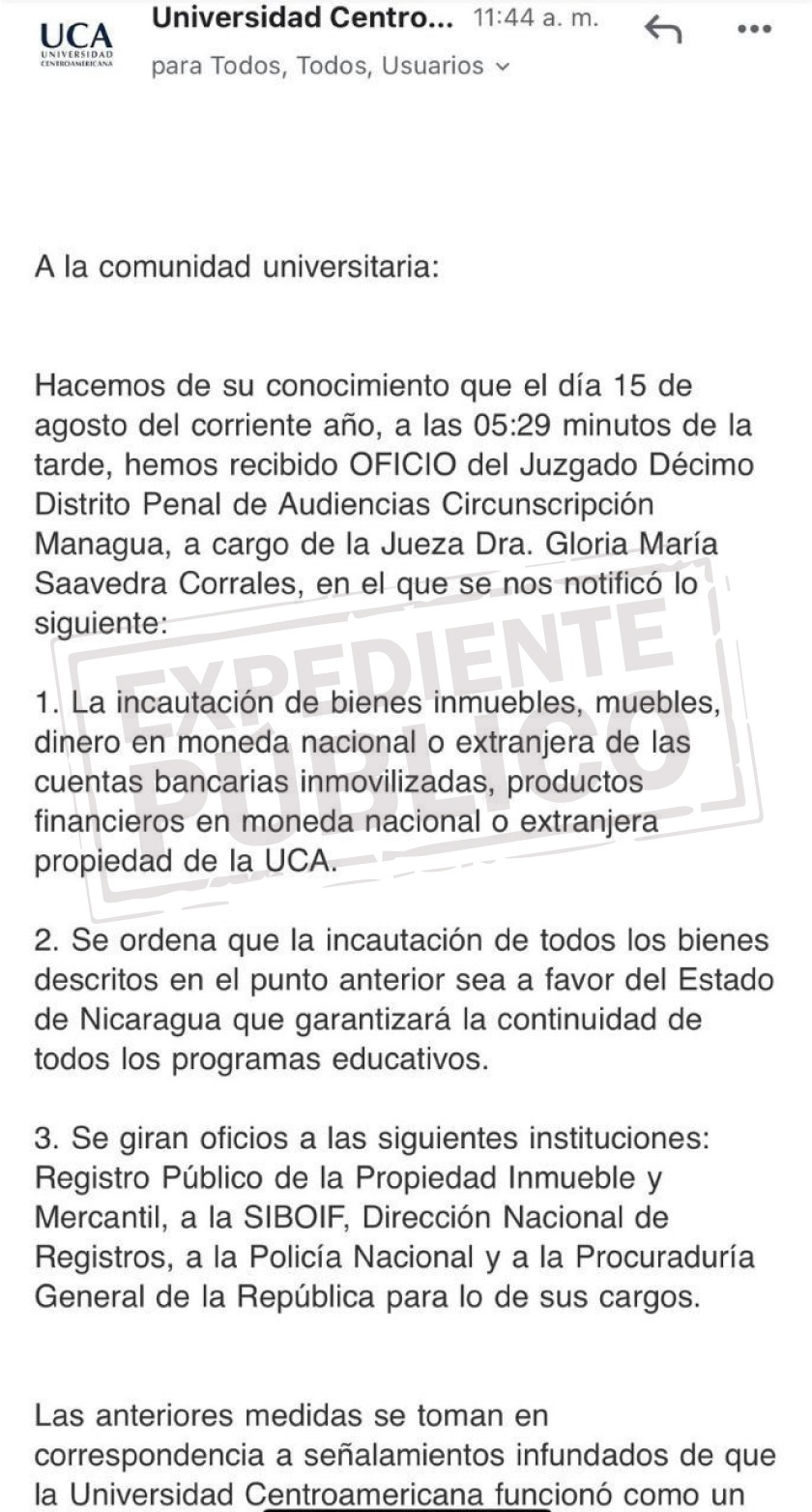 La confiscación de la principal universidad privada de Nicaragua la ordenó la jueza Gloria María Saavedra Corrales, quien además incautó el “dinero en moneda nacional o extranjera de las cuentas bancarias inmovilizadas, productos financieros en moneda nacional o extranjera propiedad de esta alma mater», informó la UCA en un comunicado a su personal y a los estudiantes al medio día de este 16 de agosto de 2023.