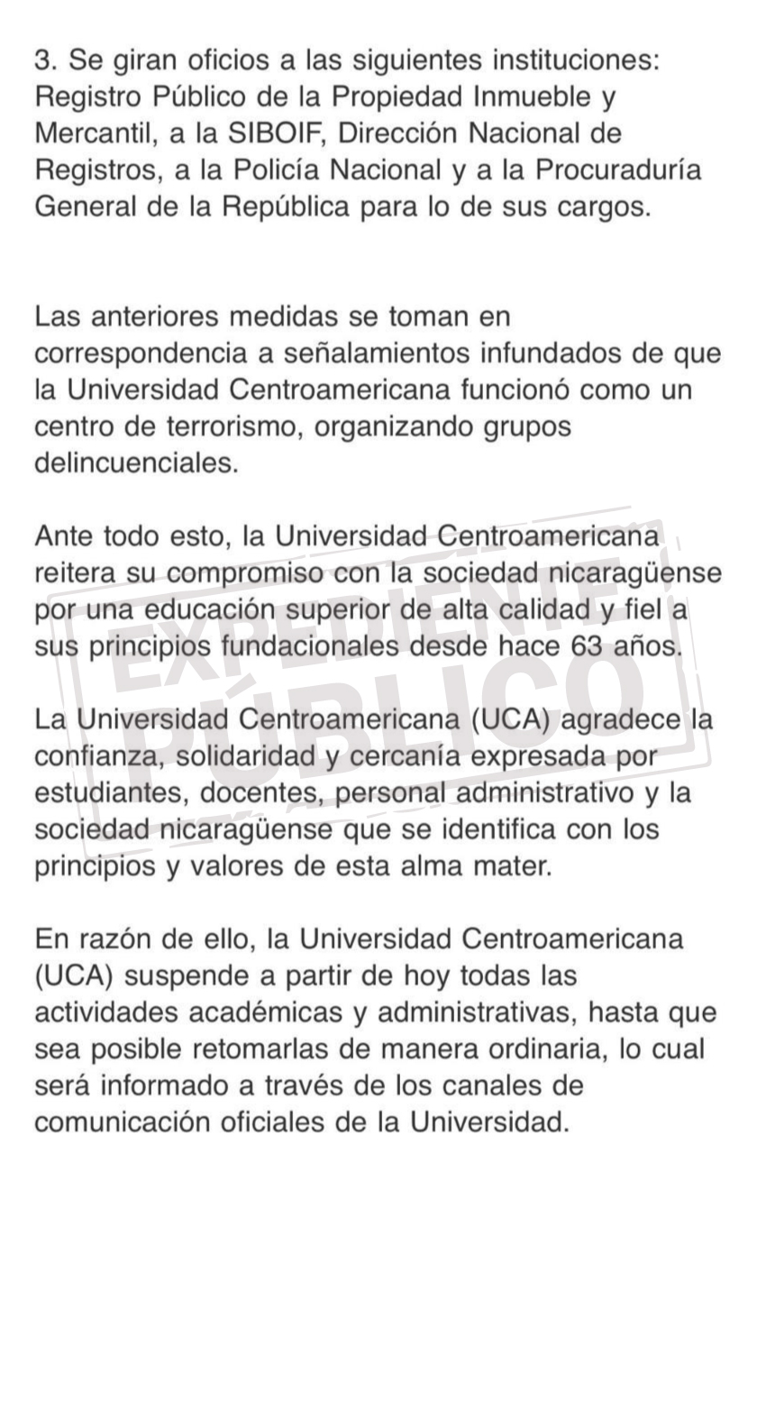 “Se ordena que la incautación de todos los bienes (…) a favor del Estado de Nicaragua que garantizará la continuidad de todos los programas educativos”, se lee en la comunicación interna que enviaron las autoridades a la comunidad universitaria.