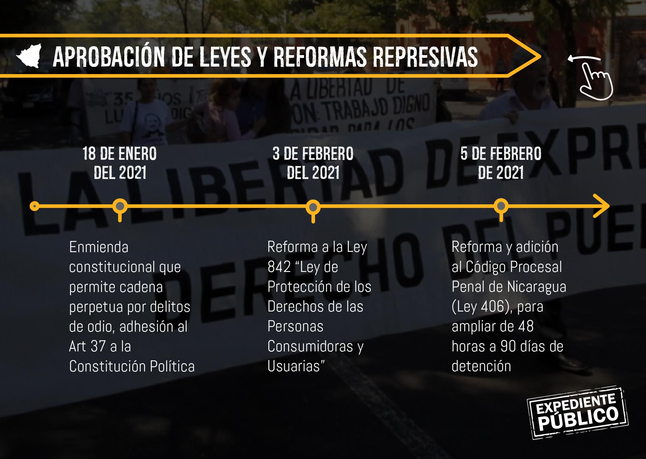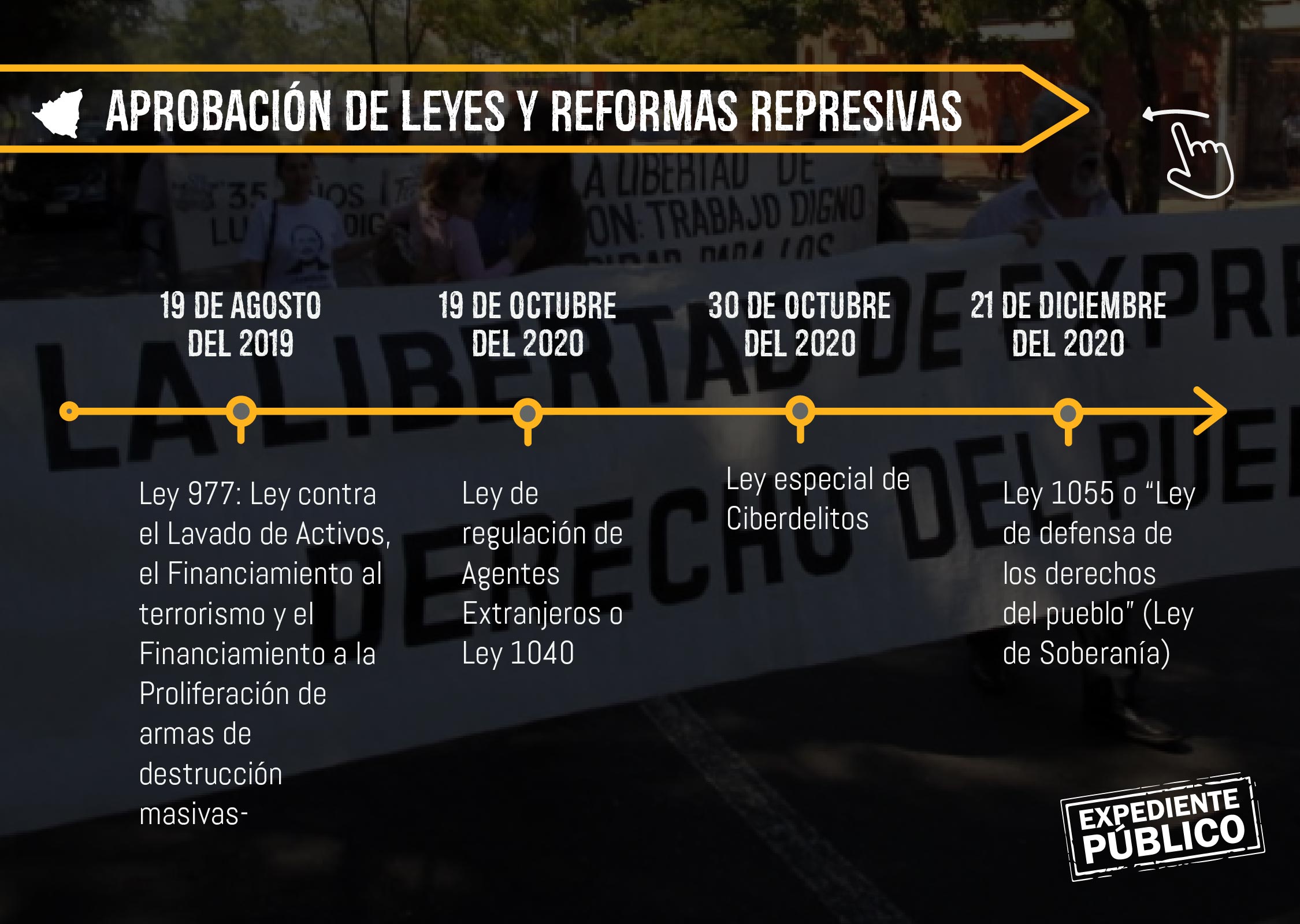 *Expediente Público muestra cómo cuatro años después de las protestas de abril, el recrudecimiento de las medidas concretadas en leyes por el régimen de Daniel Ortega, son constantes. También se exponen las graves afectaciones que han causado en cuatro sectores de la sociedad civil: universidades, ONG, medios de comunicación y manifestantes de la oposición que se convirtieron en presos políticos.