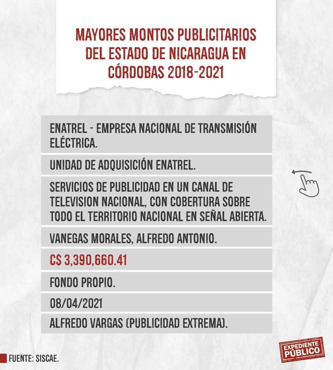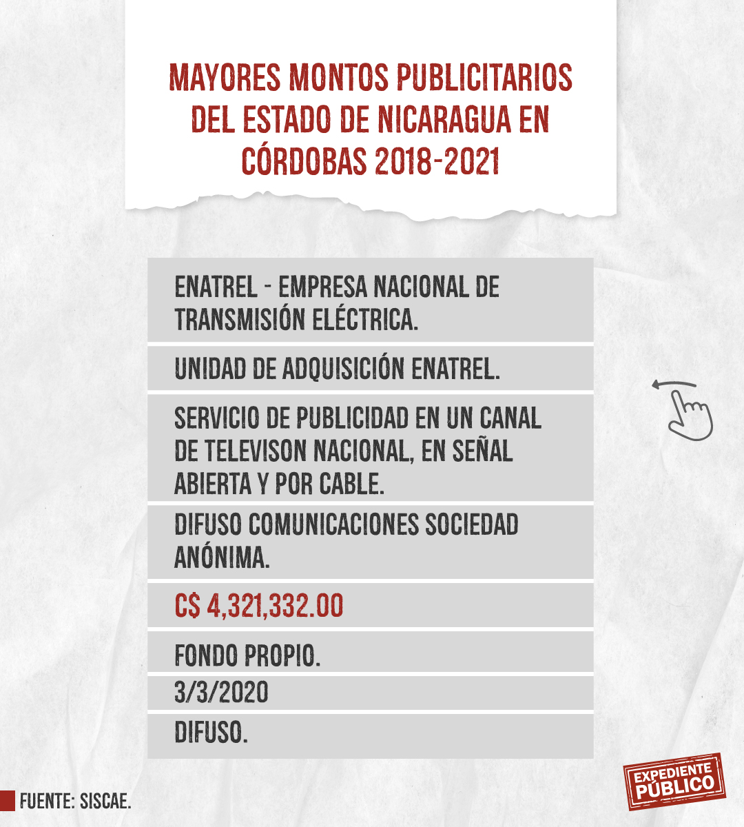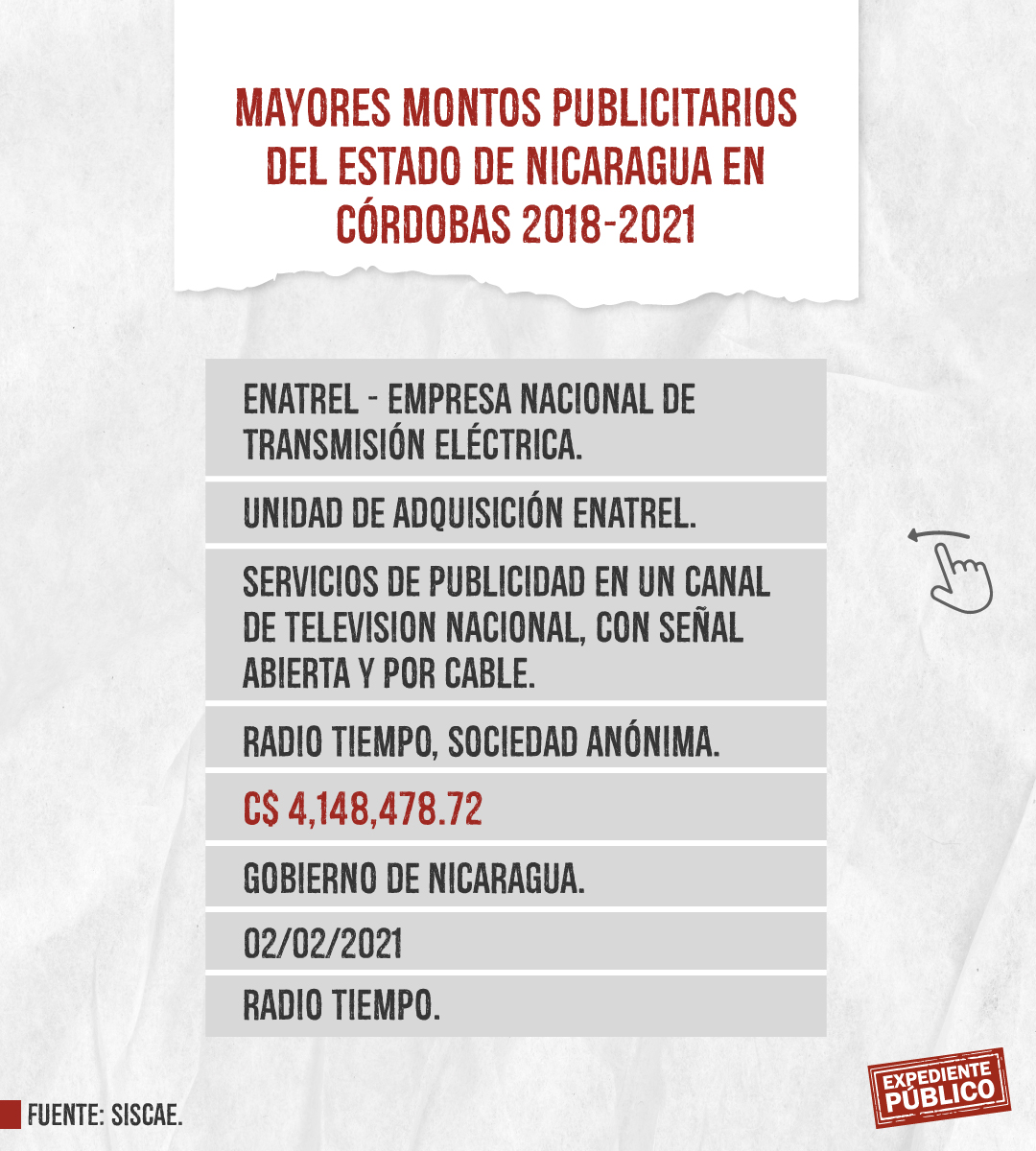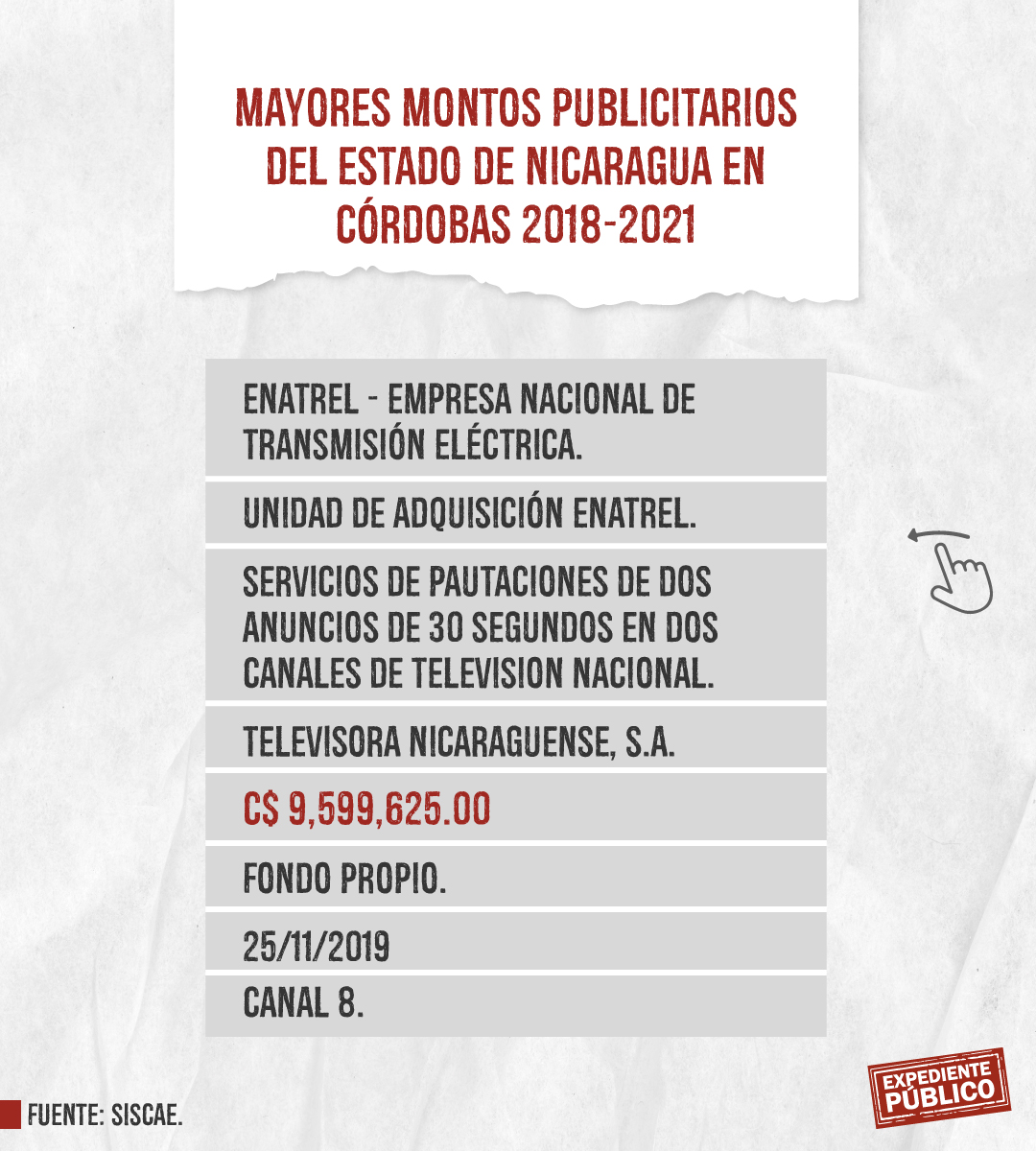 Expediente Público analizó más de mil licitaciones publicitarias entre 2018 y 2021 dentro del Siscae, con el resultado de 207 contratos ejecutados o adjudicados claramente identificados destacando la Lotería Nacional con montos totales de 393 mil córdobas y 164 mil dólares, en total unos 175 mil dólares entre 2018 y 2021. El mayor montó lo adquirió Comunicación Televisiva S.A. (Comuntesa), cuya dirección oficial coincide con el domicilio del periodista Alberto Mora, que recibió 26,400 dólares el 14 de diciembre de 2021.