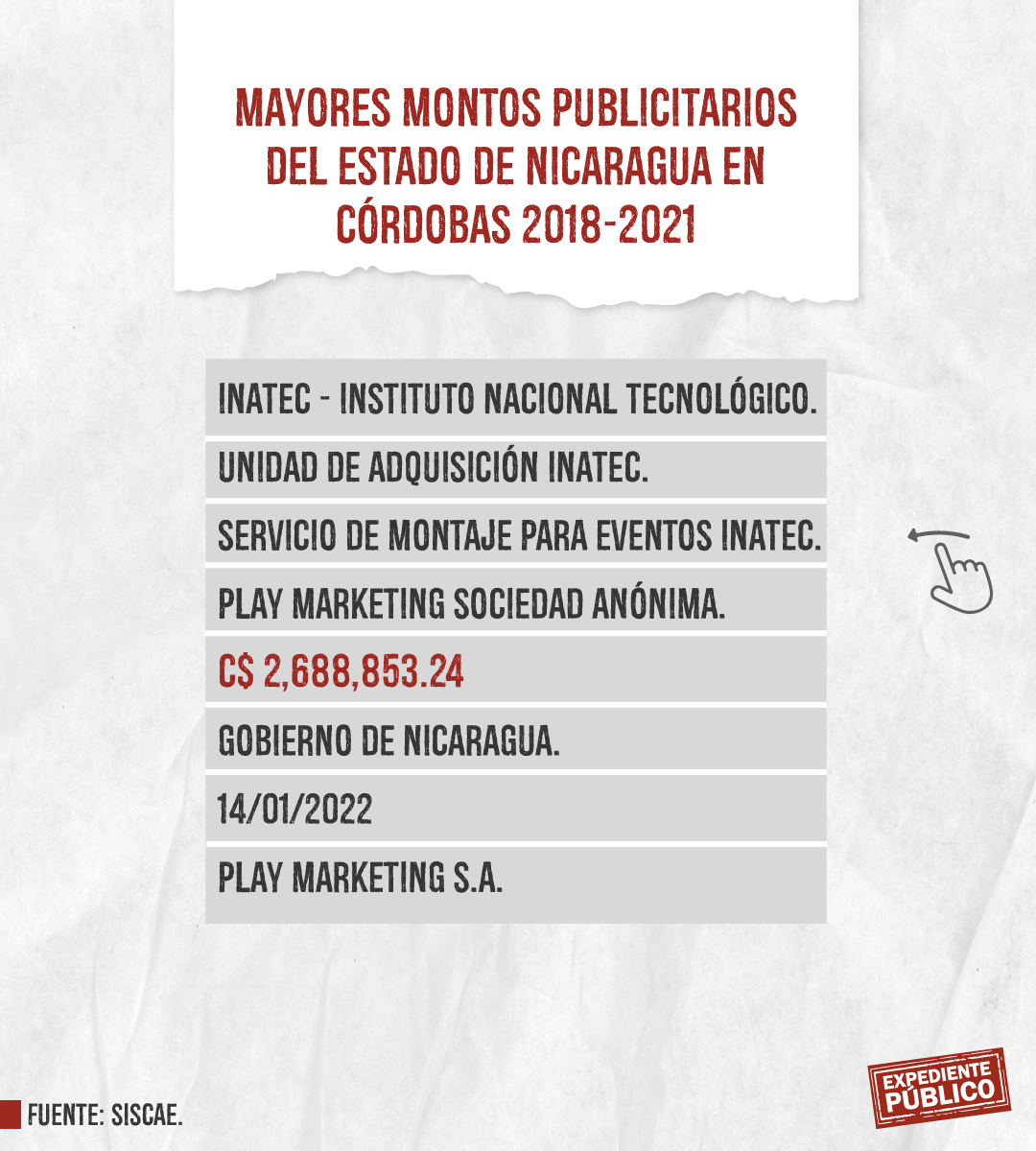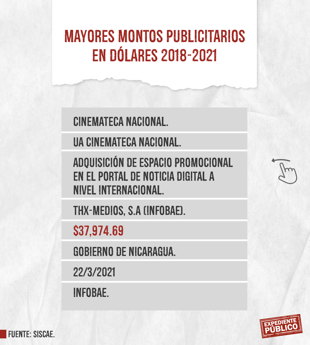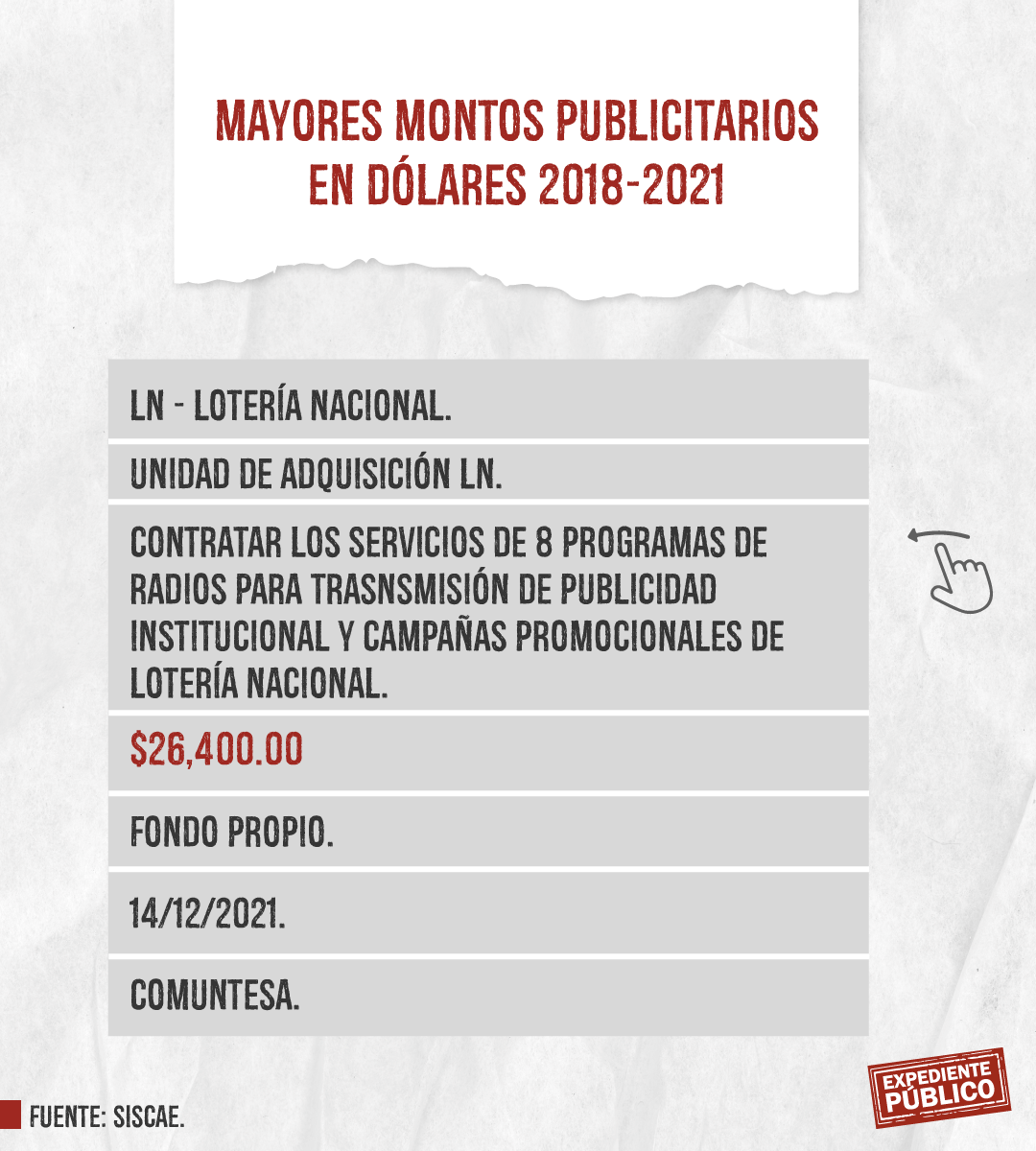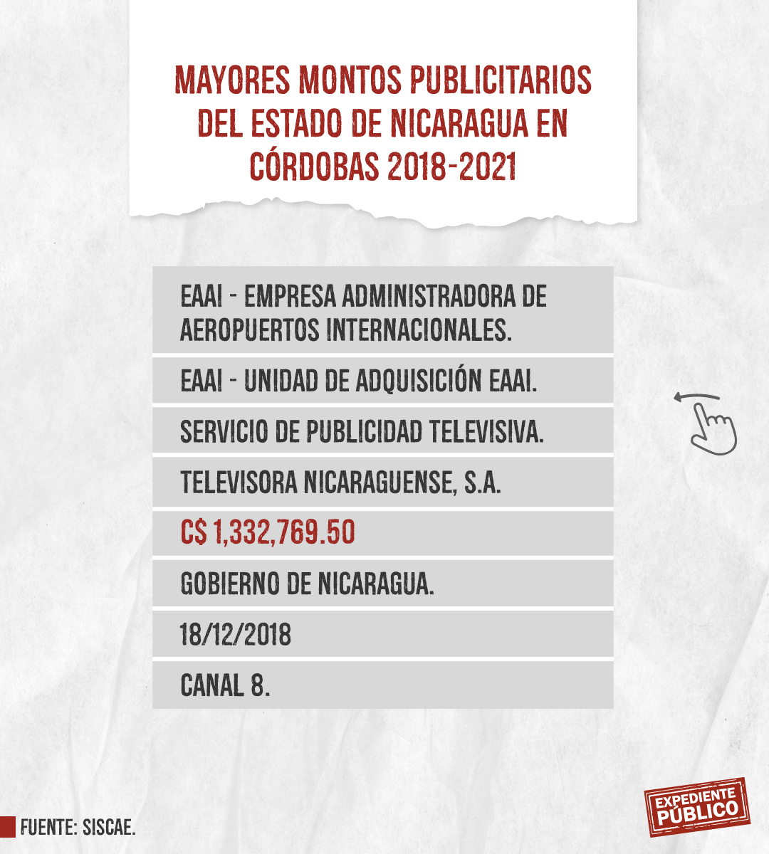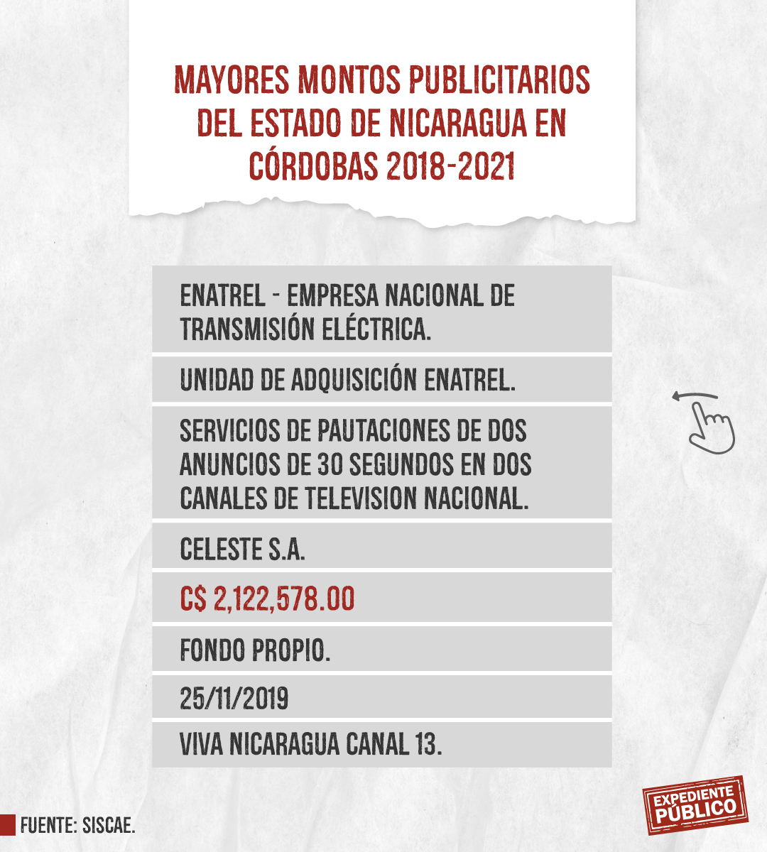 Expediente Público analizó más de mil licitaciones publicitarias entre 2018 y 2021 dentro del Siscae, con el resultado de 207 contratos ejecutados o adjudicados claramente identificados destacando la Lotería Nacional con montos totales de 393 mil córdobas y 164 mil dólares, en total unos 175 mil dólares entre 2018 y 2021. El mayor montó lo adquirió Comunicación Televisiva S.A. (Comuntesa), cuya dirección oficial coincide con el domicilio del periodista Alberto Mora, que recibió 26,400 dólares el 14 de diciembre de 2021.