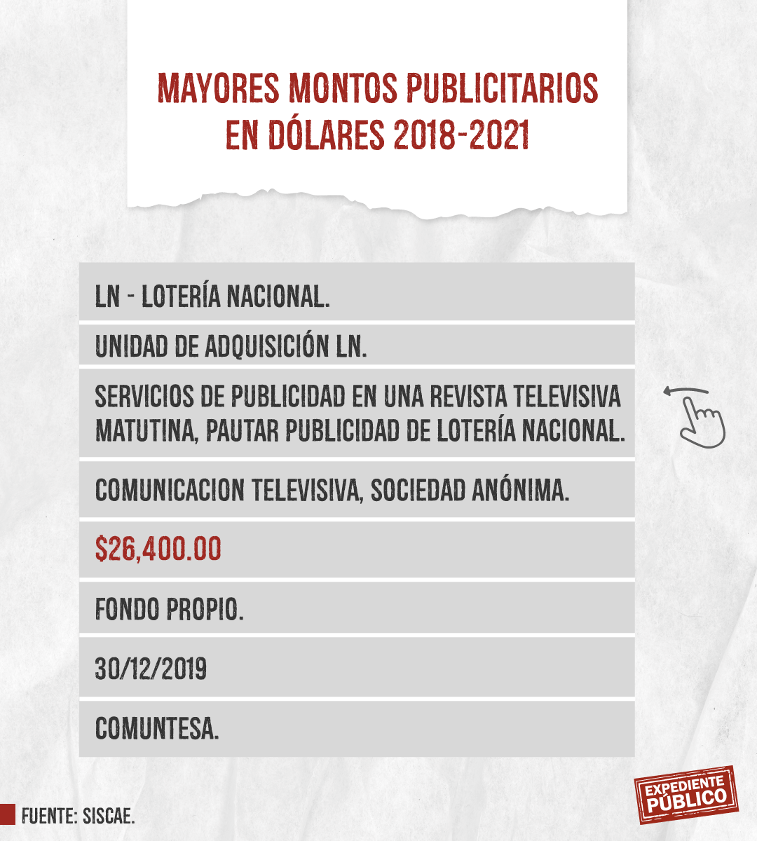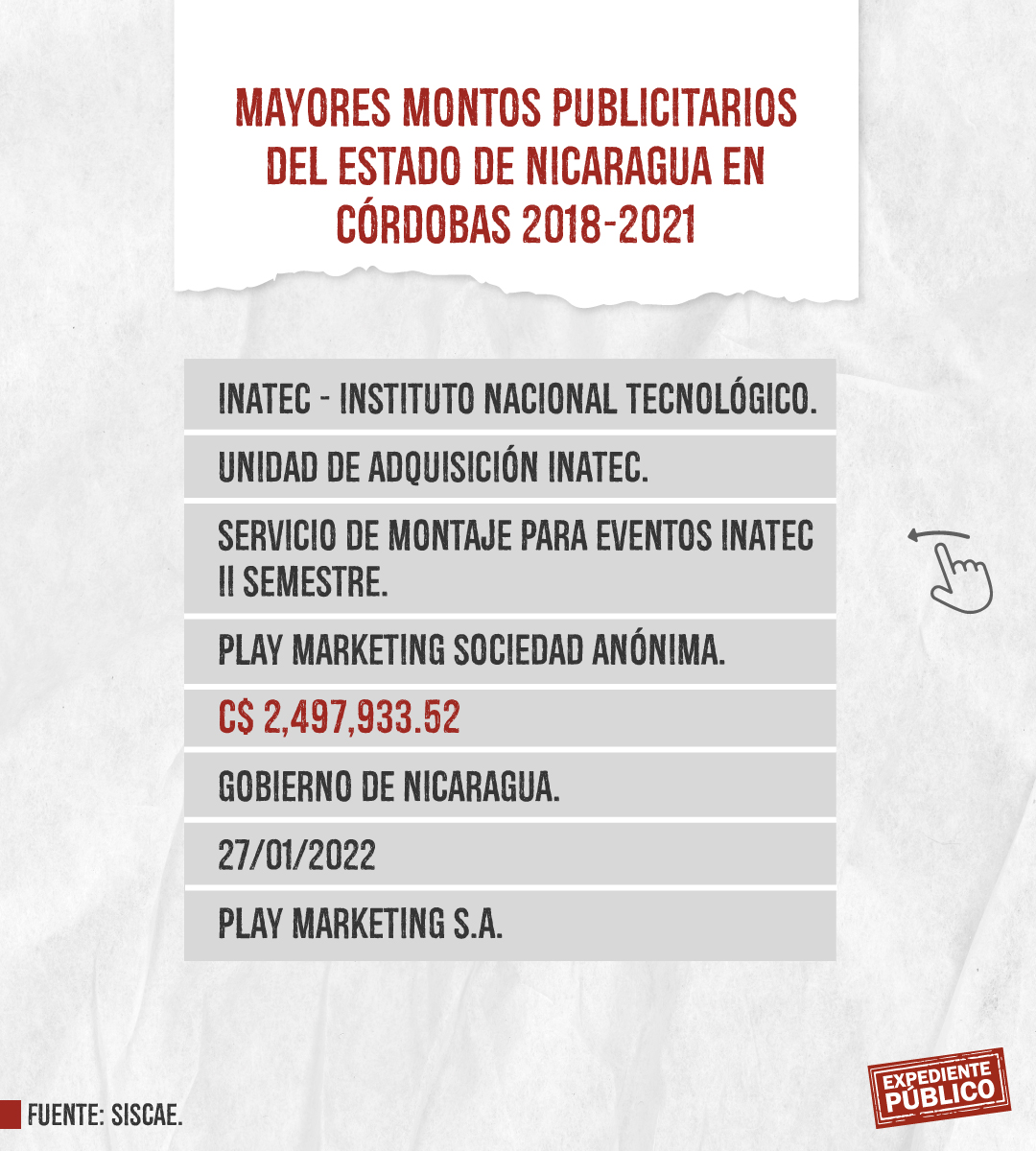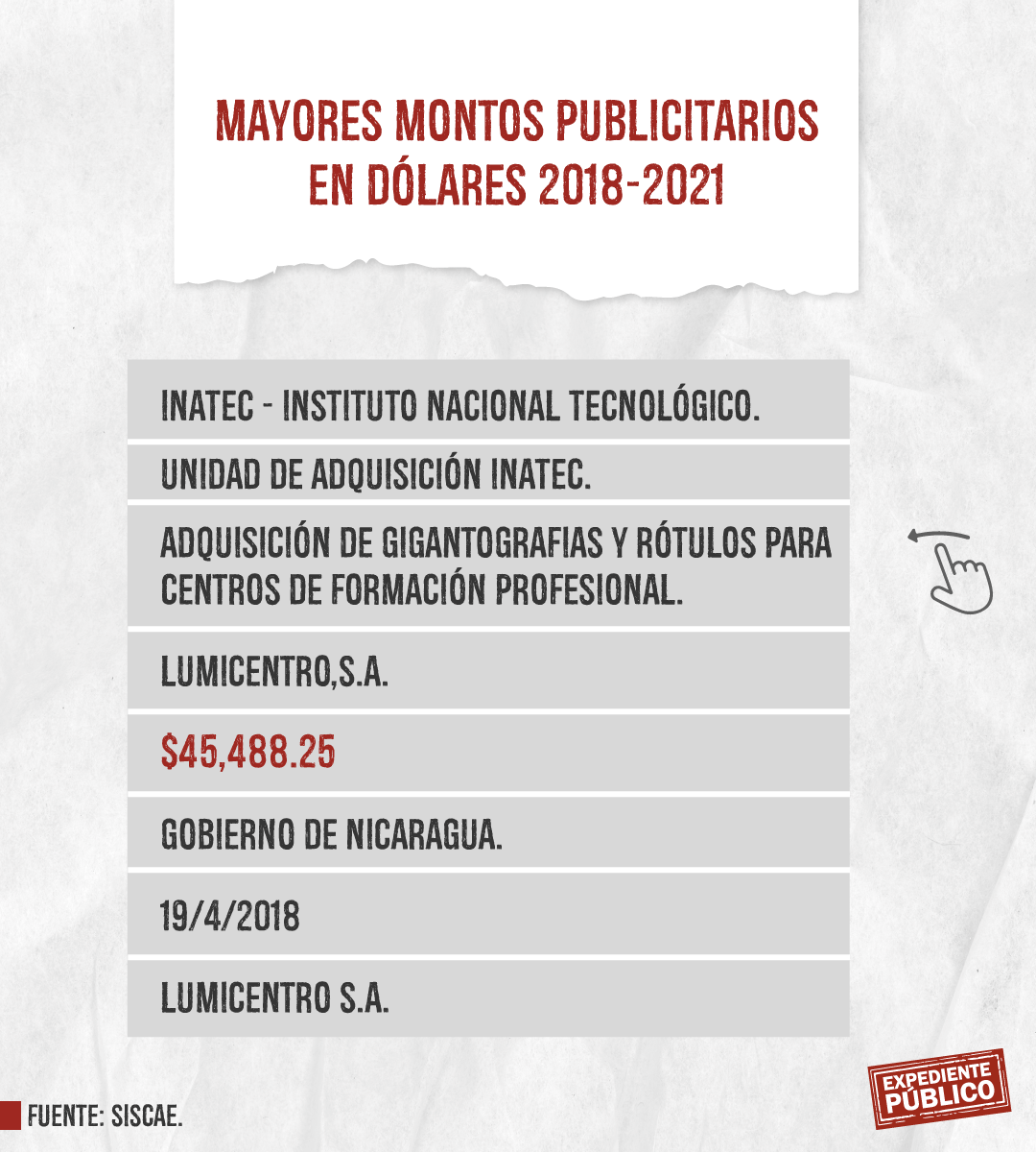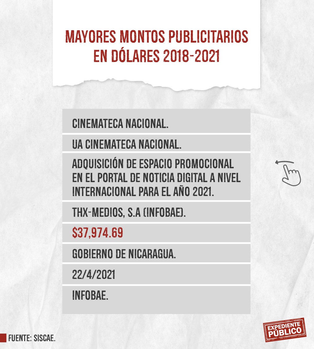 Expediente Público analizó más de mil licitaciones publicitarias entre 2018 y 2021 dentro del Siscae, con el resultado de 207 contratos ejecutados o adjudicados claramente identificados destacando la Lotería Nacional con montos totales de 393 mil córdobas y 164 mil dólares, en total unos 175 mil dólares entre 2018 y 2021. El mayor montó lo adquirió Comunicación Televisiva S.A. (Comuntesa), cuya dirección oficial coincide con el domicilio del periodista Alberto Mora, que recibió 26,400 dólares el 14 de diciembre de 2021.
