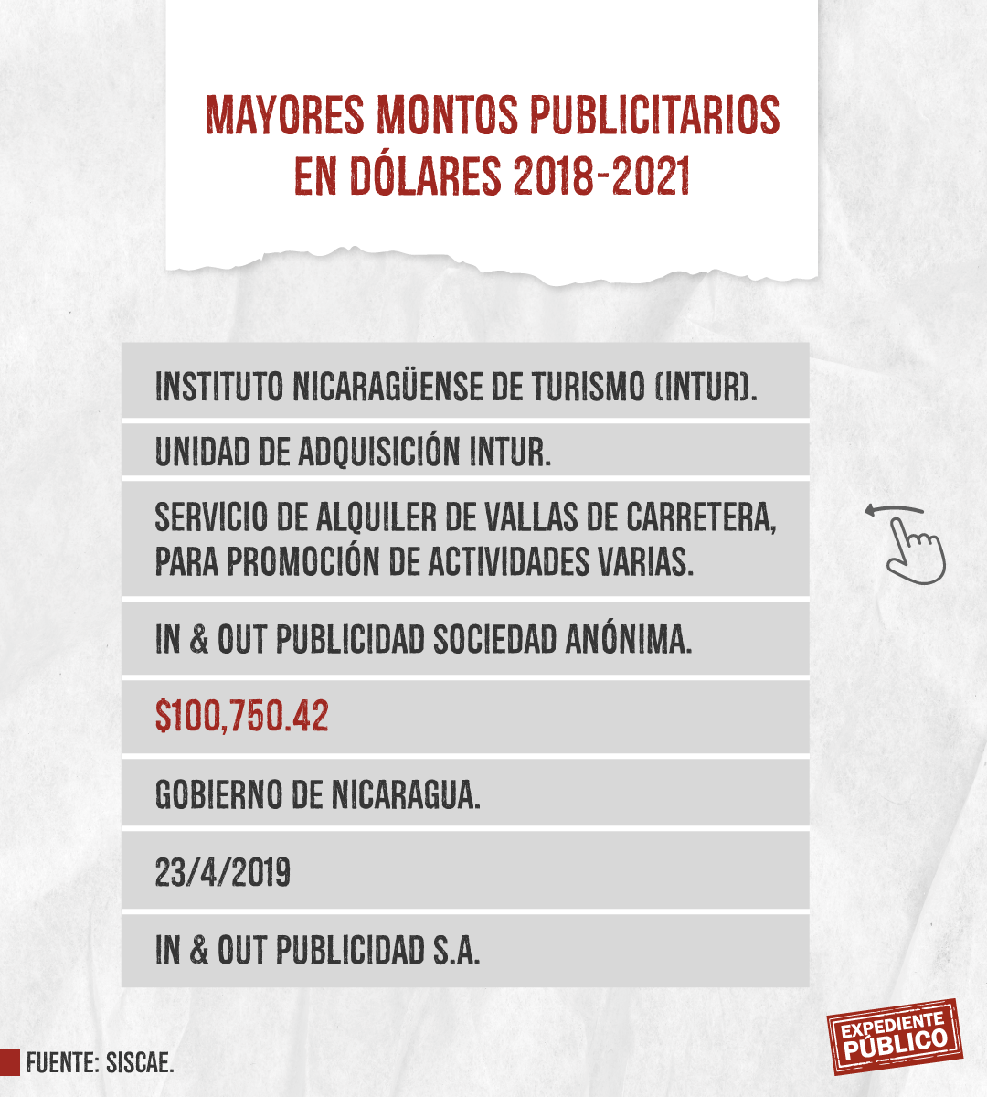 La mayor contratación pública documentada por el Siscae  en materia de publicidad la tuvo el Instituto de Turismo (Intur), que otorgó 100,750 dólares en contratos a In&Out por alquiler de vallas publicitarias, también Lumicentro recibió 45,488.25 para una valla gigante de INATEC y la Cinemateca Nacional pagó casi 76 mil dólares por anunciar un festival de cine en Infobae.