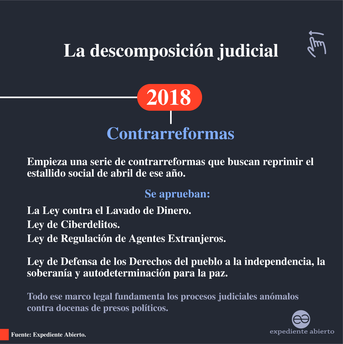 Con las protestas sociales de 2018, el estado nicaragüense impulsó una serie de contrarreformas que fueron el inicio de un proceso de derogaciones y creación de leyes para aumentar el sistema represivo del Estado, fortaleciendo la captura política de las instituciones estatales, desconociendo el debido proceso e irrespetando las garantías constitucionales y procesales, como una forma de validar las arbitrariedades de forma legal.