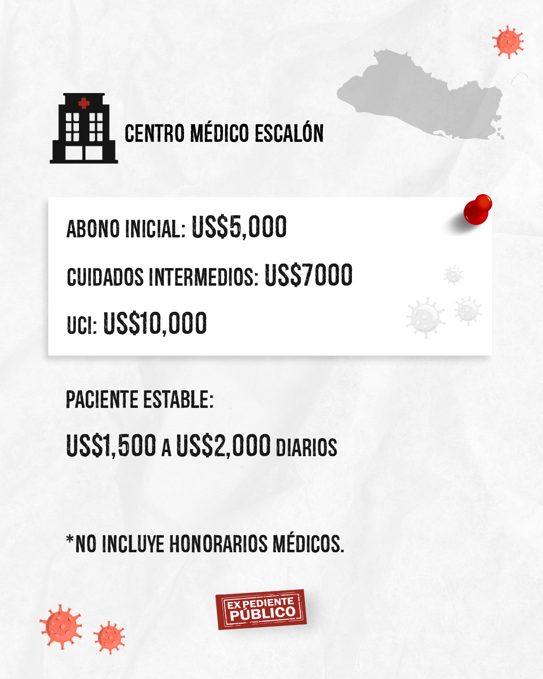 Un hospital privado de San Salvador, Centro Médico Escalón, pide un abono inicial, para cuidados normales, de $5000 dólares. El abono inicial sube a $7000 dólares si se trata de cuidados intermedios y si es para cuidados en UCI se le pide un abono de $10.000 dólares.