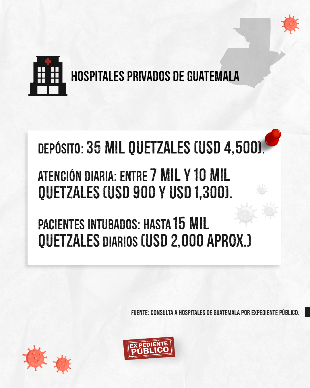 Los costos de hospitalización por COVID-19 en Guatemala son similares a los de El Salvador. La inmensa mayoría de hospitales piden 35 mil quetzales de depósito (unos $4,500). El costo promedio diario es de entre 7 mil y 10 mil quetzales diarios (entre $900 y $1,300). Pero en casos de pacientes intubados, puede alcanzar hasta 15 mil quetzales diarios (casi $2,000), según consultas hechas por Expediente Público en tres hospitales guatemaltecos.