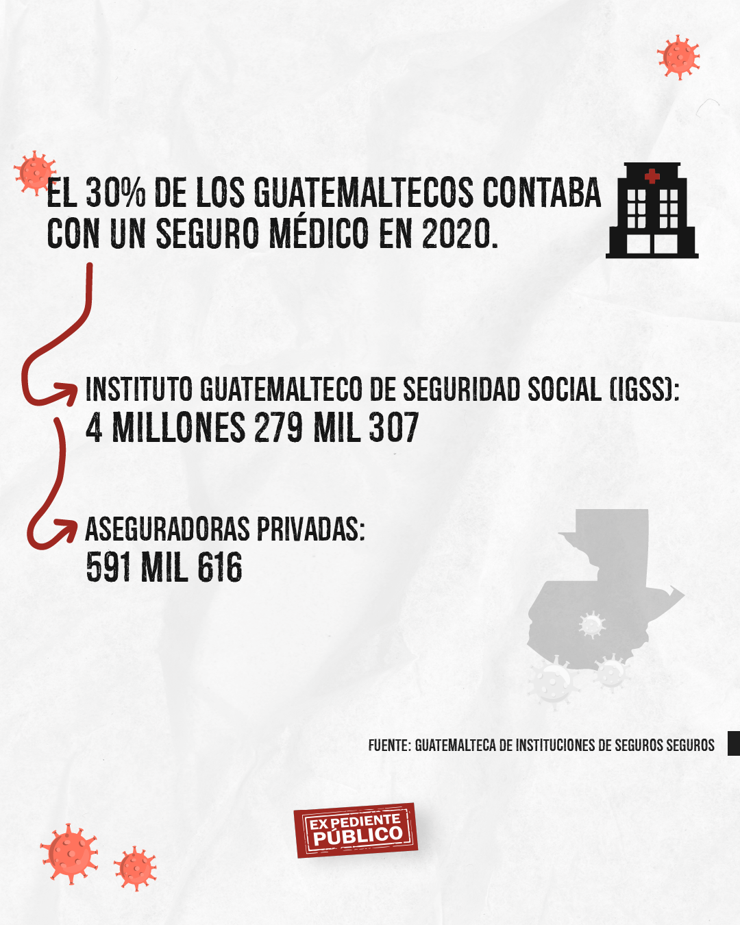 Según la Asociación Guatemalteca de Instituciones de Seguros Seguros, solo un 30% de los guatemaltecos contaba con un seguro en 2020: 4 millones 279 mil 307 por el Instituto Guatemalteco de Seguridad Social (IGSS) y 591 mil 616 por aseguradoras privadas.
