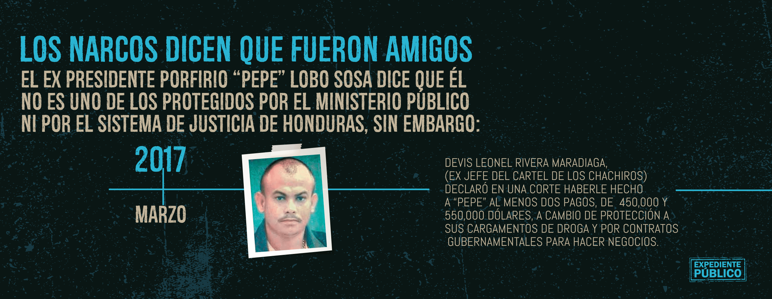 Pero en marzo de 2017, mientras la justicia estadounidense juzgaba a su hijo, Fabio Lobo, por narcotráfico, el exjefe del cartel de Los Cachiros, Devis Leonel Rivera Maradiaga, declaró en una Corte de Nueva York haberle hecho a “Pepe” al menos dos pagos, de entre 450,000 y 550,000 dólares cada uno, a cambio de protección a sus cargamentos de droga y por contratos gubernamentales para hacer negocios.