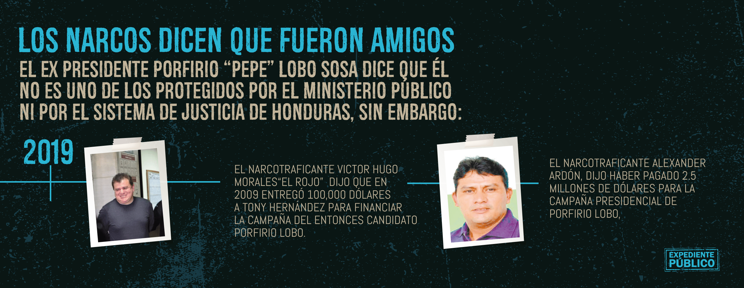 A las acusaciones de Rivera Maradiaga, se sumaron las declaraciones del narcotraficante confeso Víctor Hugo Morales “El Rojo”, quien dijo que en 2009 entregó 100,000 dólares a Tony Hernández para financiar la campaña del entonces candidato presidencial Porfirio Lobo y de Juan Orlando Hernández, quien llegaría a ocupar la presidencia del Legislativo y pasaría a ser considerado el “delfín” de Lobo, su sustituto en la presidencia de la República, como al final sucedió.