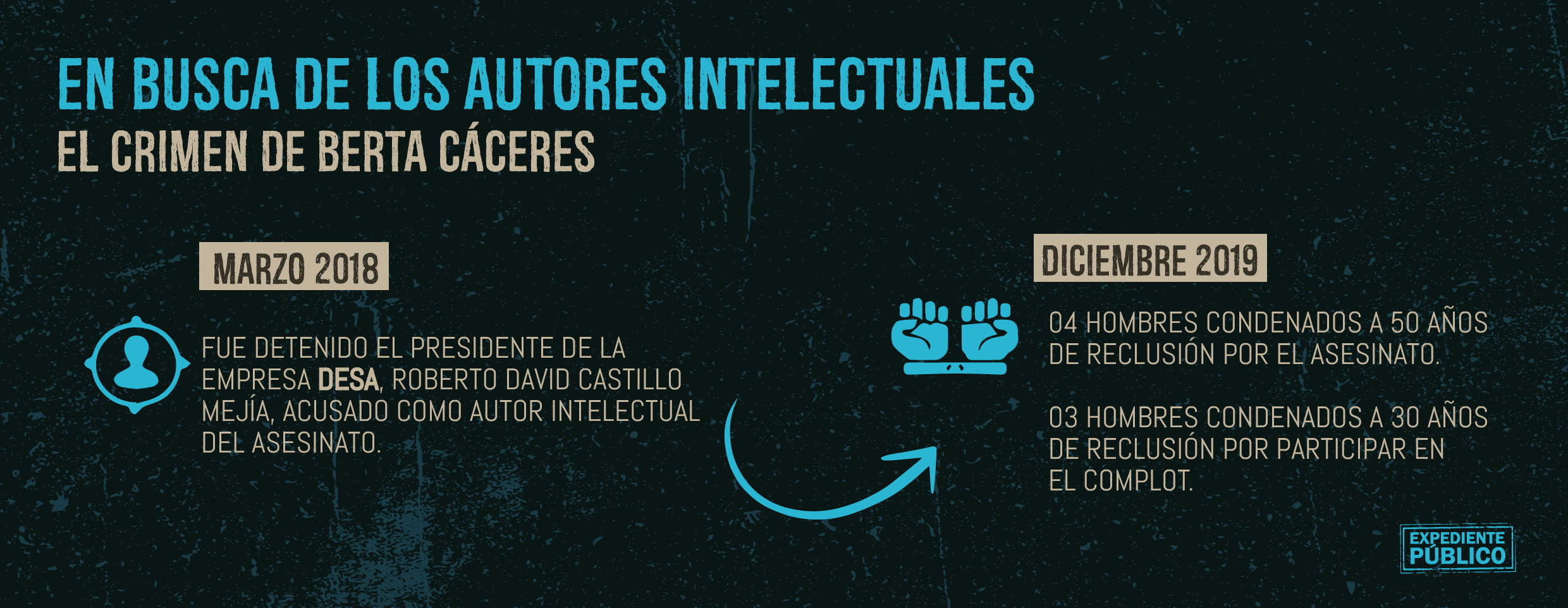 En diciembre de 2019 cuatro hombres fueron condenados a 50 años de reclusión por el asesinato y otros tres hombres a 30 años de reclusión por participar en el complot. Adicionalmente, el 2 de marzo de 2018, coincidentemente con el segundo aniversario de la muerte de Cáceres, fue detenido el presidente de la empresa DESA, Roberto David Castillo Mejía, acusado como autor intelectual del asesinato.