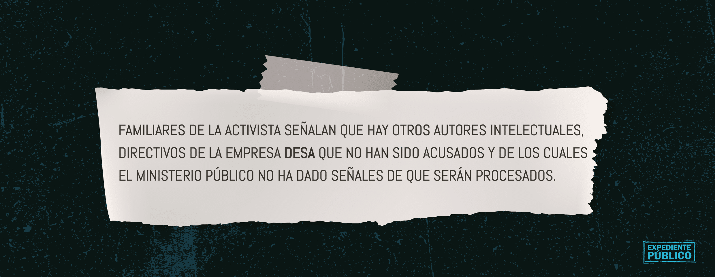Sin embargo, familiares de la activista señalan que hay otros autores intelectuales, directivos de la empresa DESA, que no han sido acusados y de los cuales el Ministerio Público no da señales de que serán procesados.