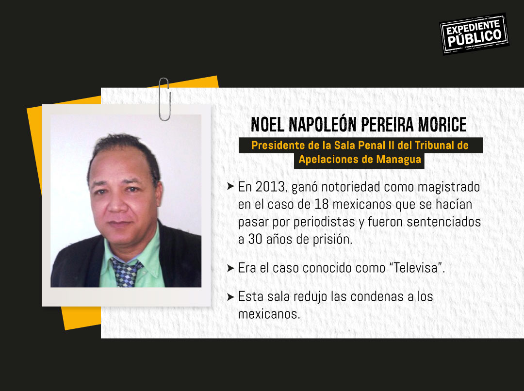 De Pereira Morice se conoce muy poco su trayectoria como abogado. En 2013, sin embargo, ya siendo magistrado de esa sala conoció la Apelación de los 18 mexicanos que se hacían pasar por periodistas y fueron sentenciados a 30 años de prisión por los delitos de crimen organizado, tráfico internacional de estupefacientes y lavado de dinero en Nicaragua, en el caso conocido como “Televisa”.