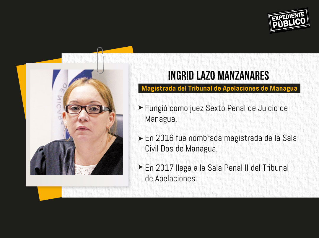 En mayo de 2016, la funcionaria Ingrid Lazo, después de 17 años de laborar en el Poder Judicial, fue nombrada magistrada de la Sala Civil Dos de Managua.