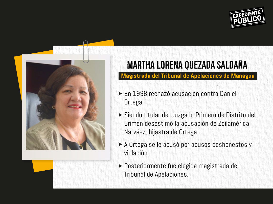 La magistrada Martha Lorena Quezada tiene una amplia trayectoria en el Poder Judicial. En sus inicios fue una connotada jueza que “llevó el caso del narcojet y el de Zoilamérica que libró a Daniel Ortega de los cargos de violación”, dijo el especialista en derecho penal.