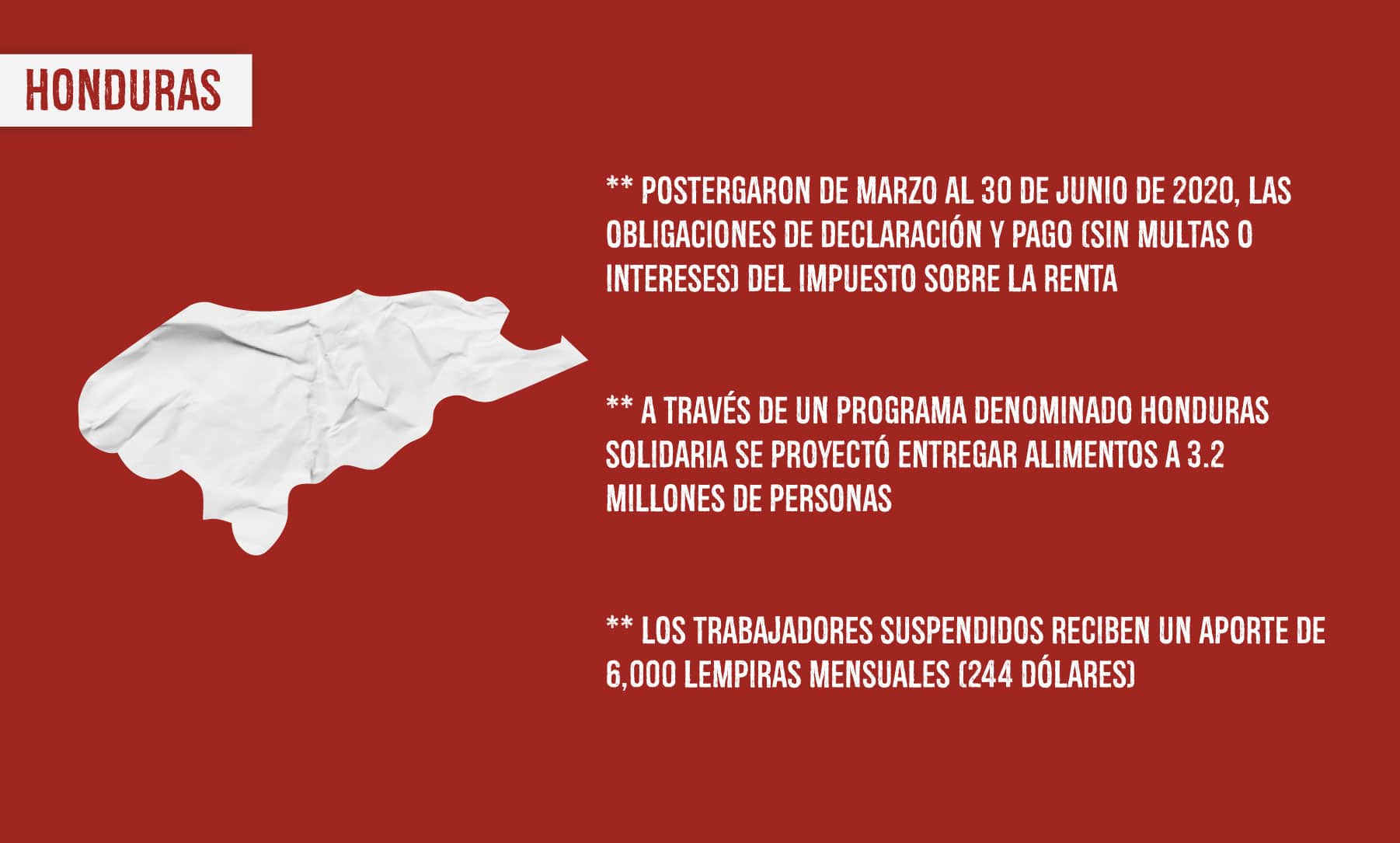 El 17 de marzo anunciaron el congelamiento de los precios de la canasta básica y un día después el estatal Banco Hondureño de la Producción y Vivienda (Banhprovi, banco de segundo piso) ordenó congelar por tres meses los pagos a préstamos otorgados.