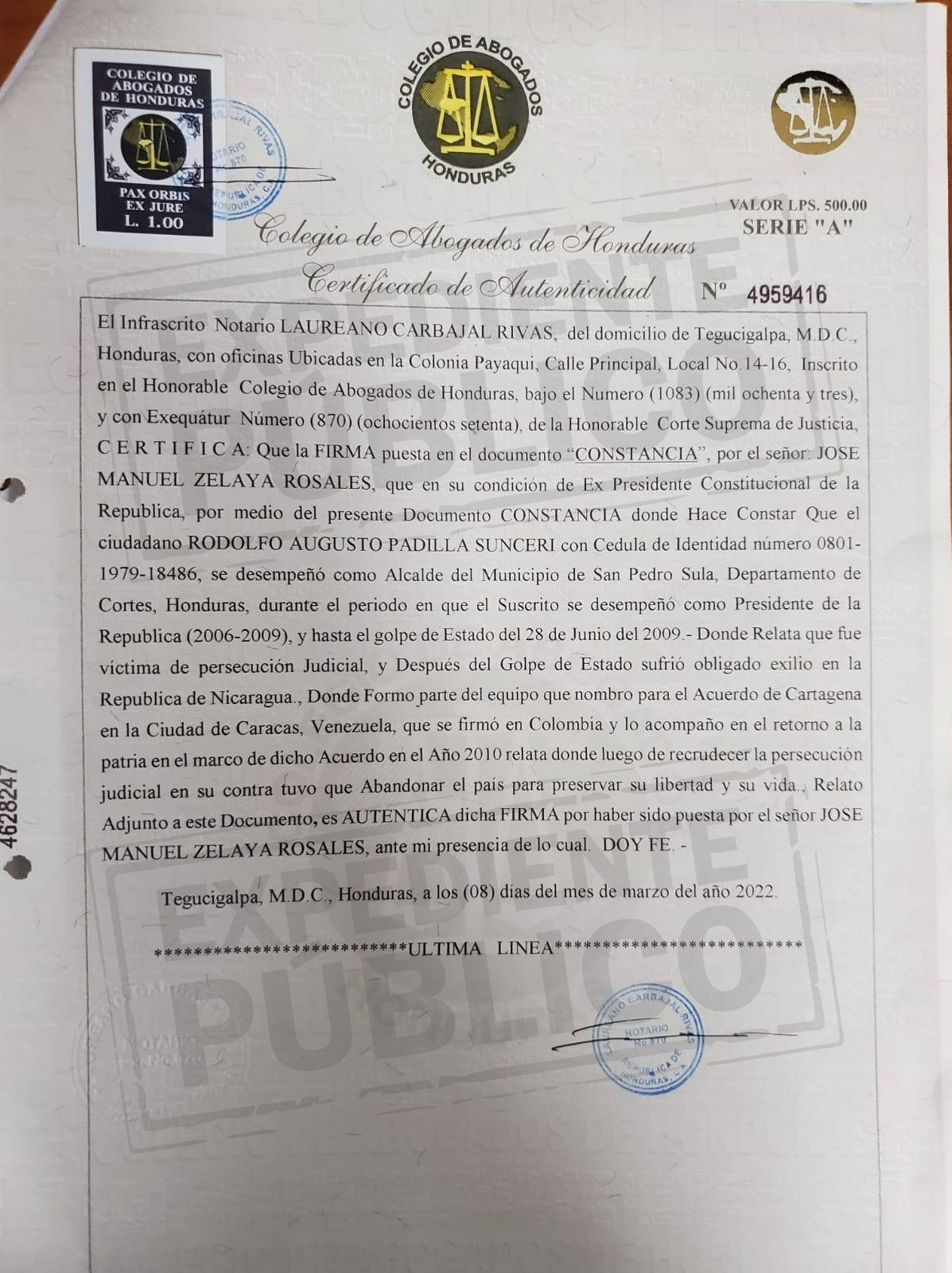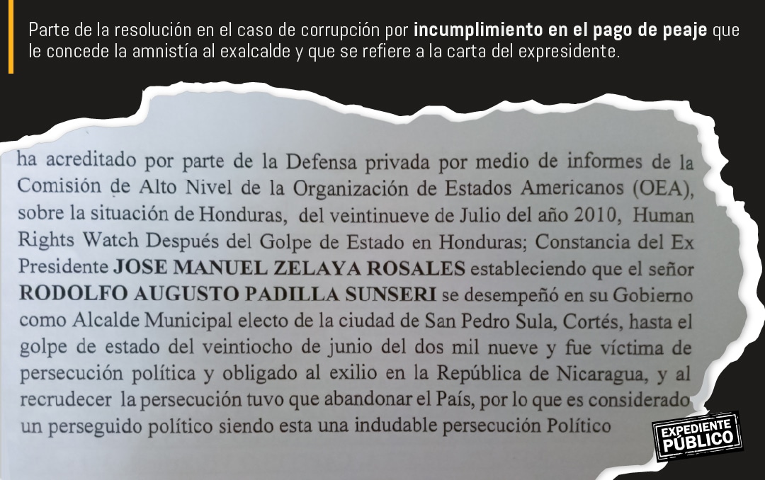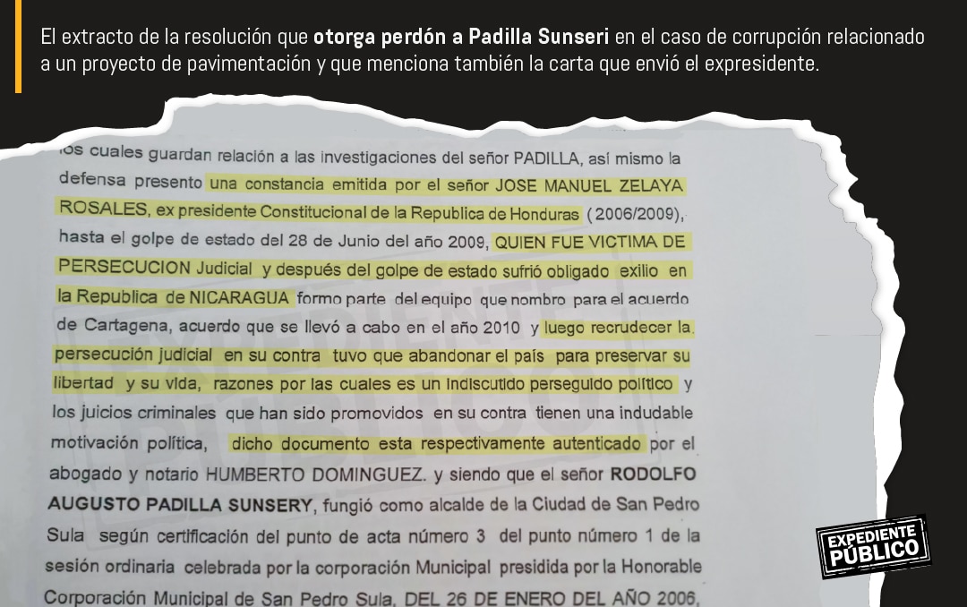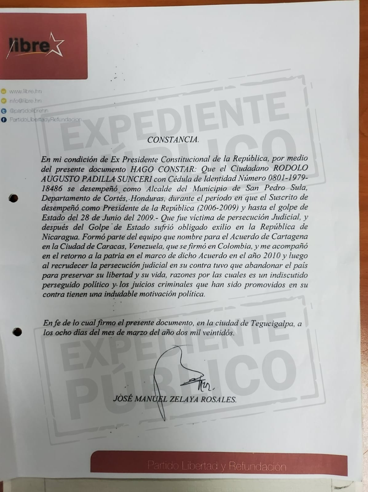 Una constancia firmada el 8 de marzo por el expresidente Manuel “Mel” Zelaya Rosales, a la que tuvo acceso Expediente Público, estaría influyendo en las decisiones de la justicia de Honduras para favorecer a su correligionario Rodolfo Padilla Sunseri, a quien durante diez años (de 2009 al 2019) el Ministerio Público (MP) le presentó al menos ocho requerimientos judiciales por diferentes delitos, entre ellos malversación de caudales públicos, abuso de autoridad y evasión dolosa al huir de la justicia hondureña en el año 2017.