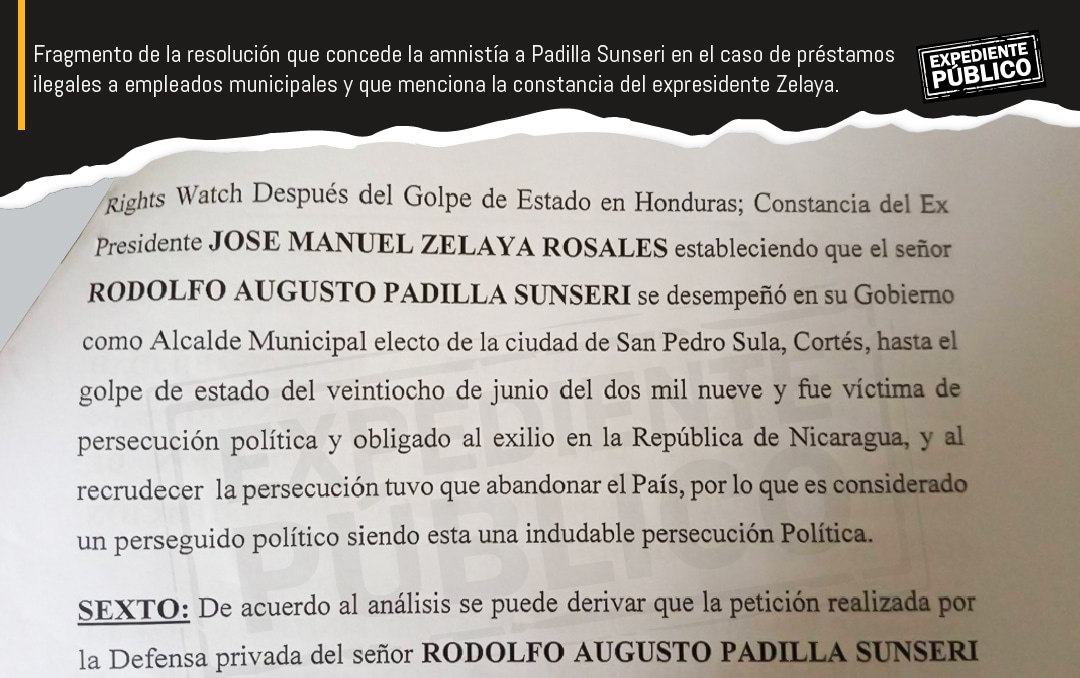 Dentro de la motivación de sus resoluciones está incluida la constancia de Zelaya, citando textualmente los mismos argumentos. Además, se rememora que Padilla fue parte del equipo que negoció el “Acuerdo de Cartagena” en el 2010, que permitió al expresidente volver a Honduras, y que por sus acciones “es un indiscutido perseguido político”.