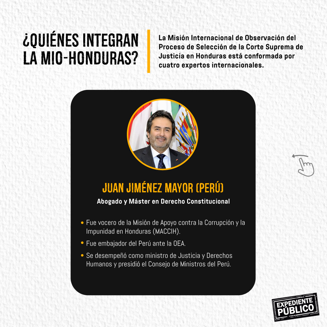 Para Jiménez Mayor, la Junta Nominadora no solo debe tener en cuenta la información que han presentado los autopostulantes sino que debe corroborar con otras instancias como el Ministerio Público, el Poder Judicial, la Comisión Nacional de Bancos y Seguros (CNBS) y la Unidad de Inteligencia Financiera, entre otros.