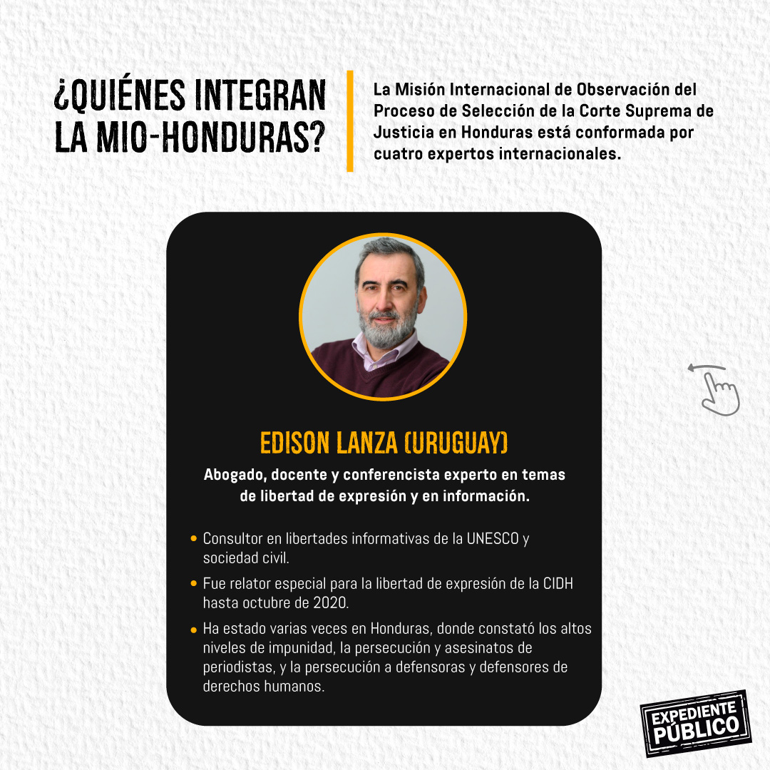 La Misión está integrada por los abogados Juan Jiménez Mayor (Perú), exvocero de la Misión de Apoyo contra la Corrupción y la Impunidad en Honduras (MACCIH), Claudia Martin (Argentina), Edison Lanza (Uruguay) y Jaime Arellano (Chile), quien es el secretario ejecutivo.