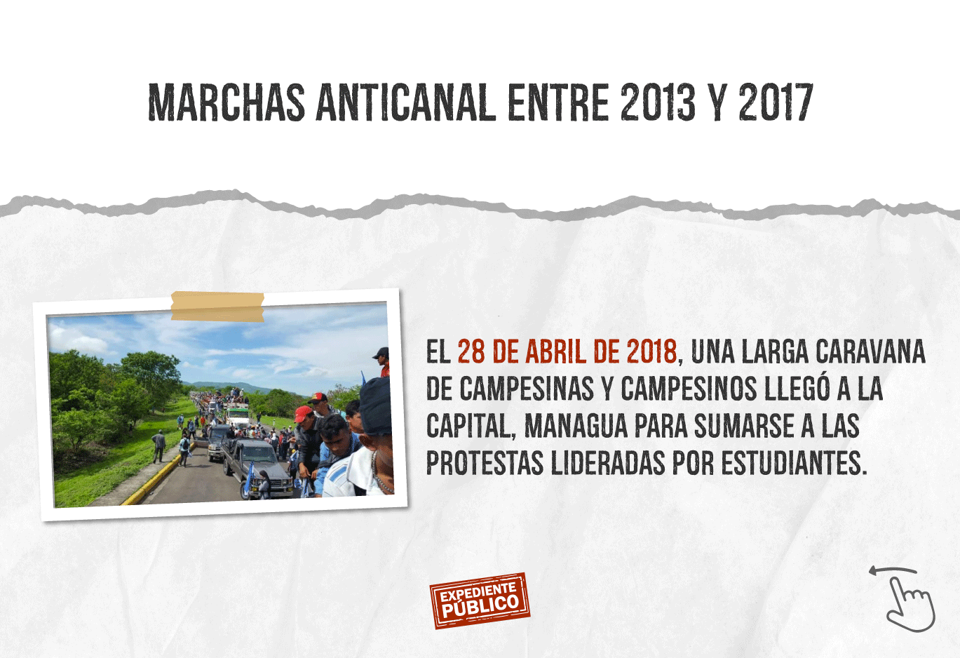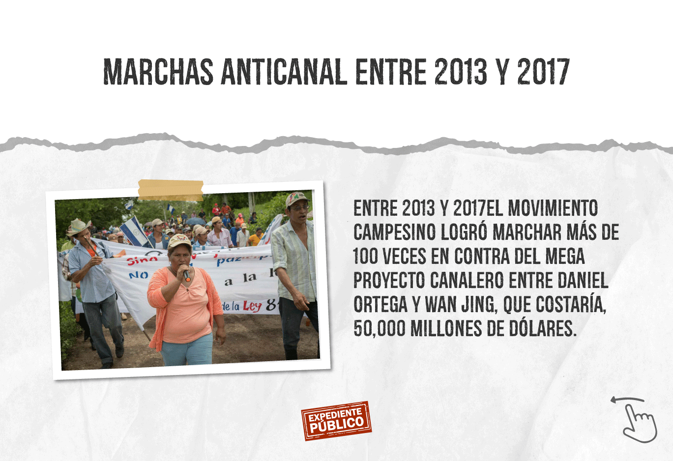 *Desde 2013 se consolidó el Movimiento Campesino, que logró hacer más de 100 marchas de protestas en Nicaragua contra la Ley 840, del proyecto canalero entre Daniel Ortega y Wang Jing, que amenaza con la expropiación de las tierras de miles de familias campesinas a nivel nacional.