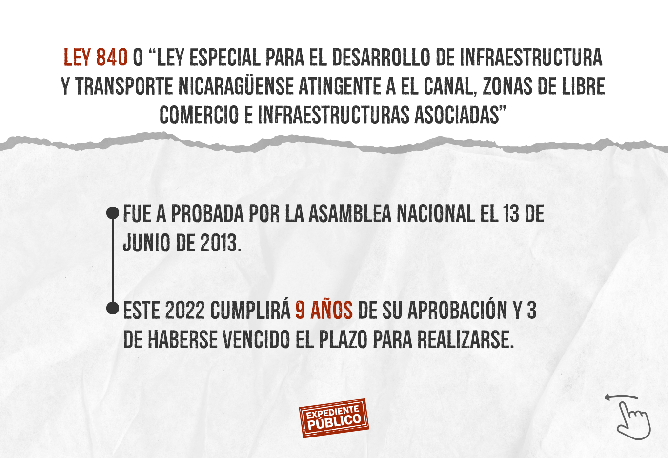 La Ley 840, (Ley especial para el desarrollo de infraestructura y transporte nicaragüense atingente a El Canal, zonas de libre comercio e infraestructuras asociadas), aprobada el 13 de junio de 2013, fue calificada por el Centro Nicaragüense de derechos humanos (Cenidh) como una de las leyes más abusivas y que ha profundizado la brutal represión del régimen en Nicaragua.