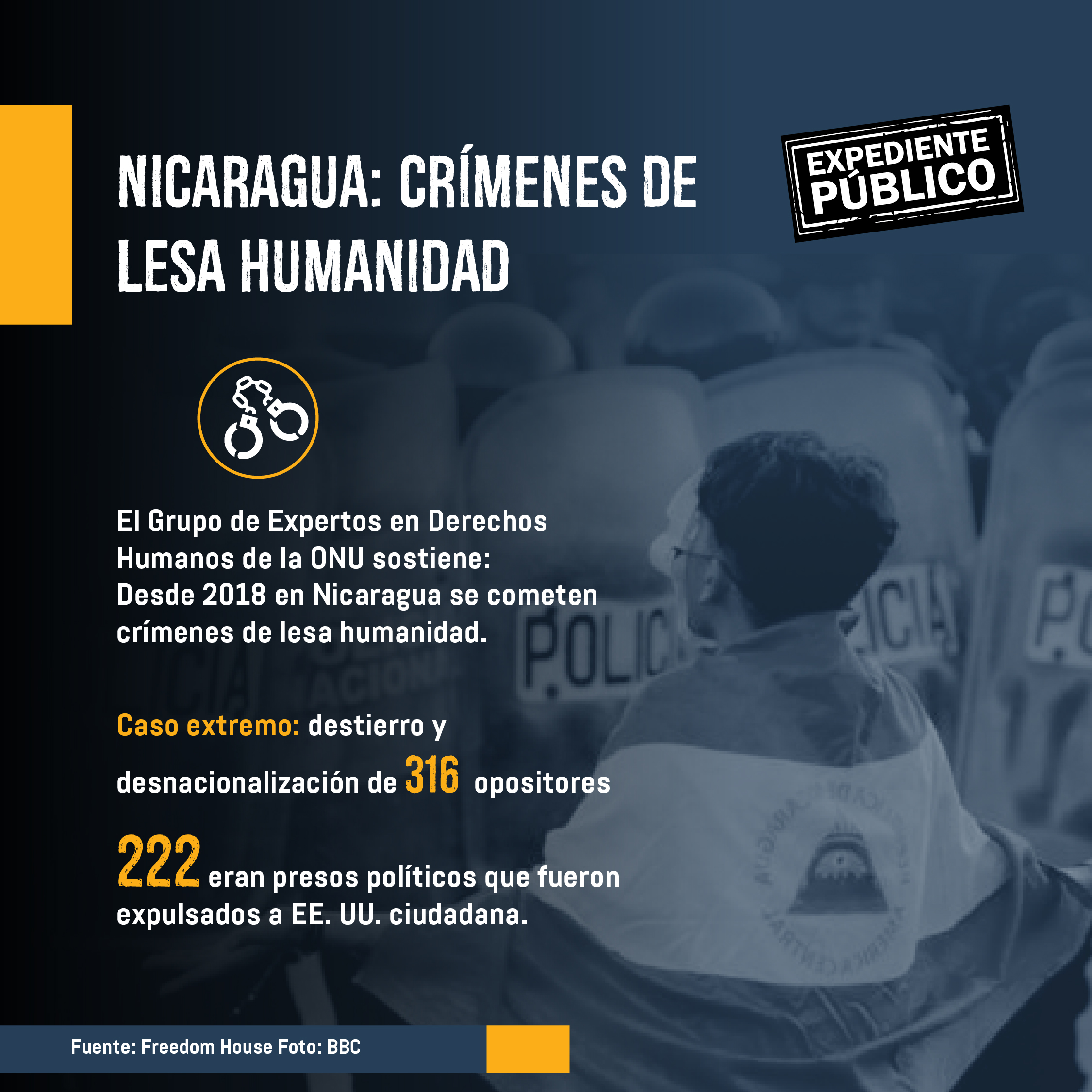 “Uno de los ejemplos más conmovedores de esto es lo que sucedió el año pasado con más de 300 nicaragüenses a quienes se les despojó de su ciudadanía y fueron prácticamente borrados de la sociedad, así como de los registros oficiales, y se les confiscaron sus propiedades y activos”, añade la investigadora.