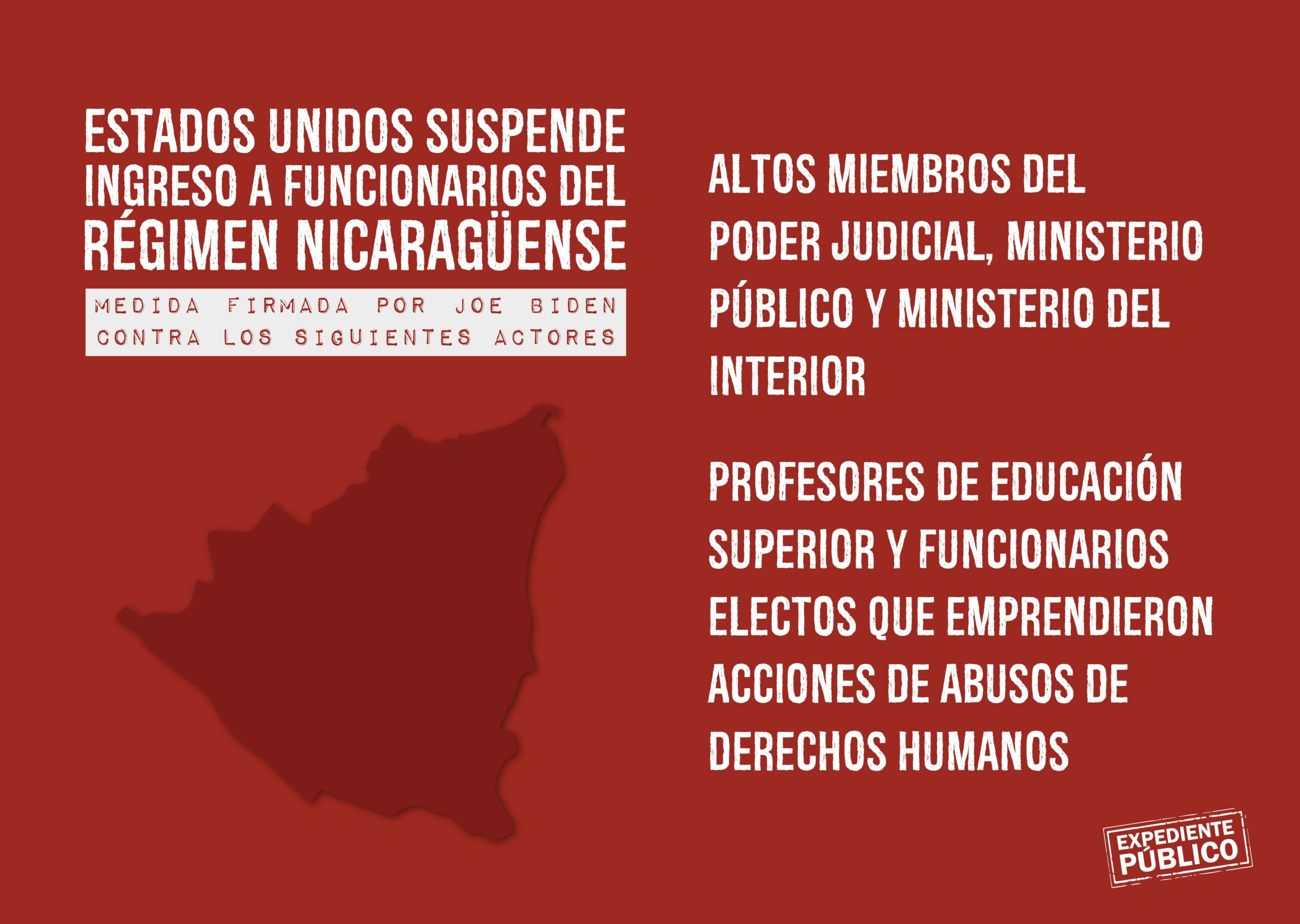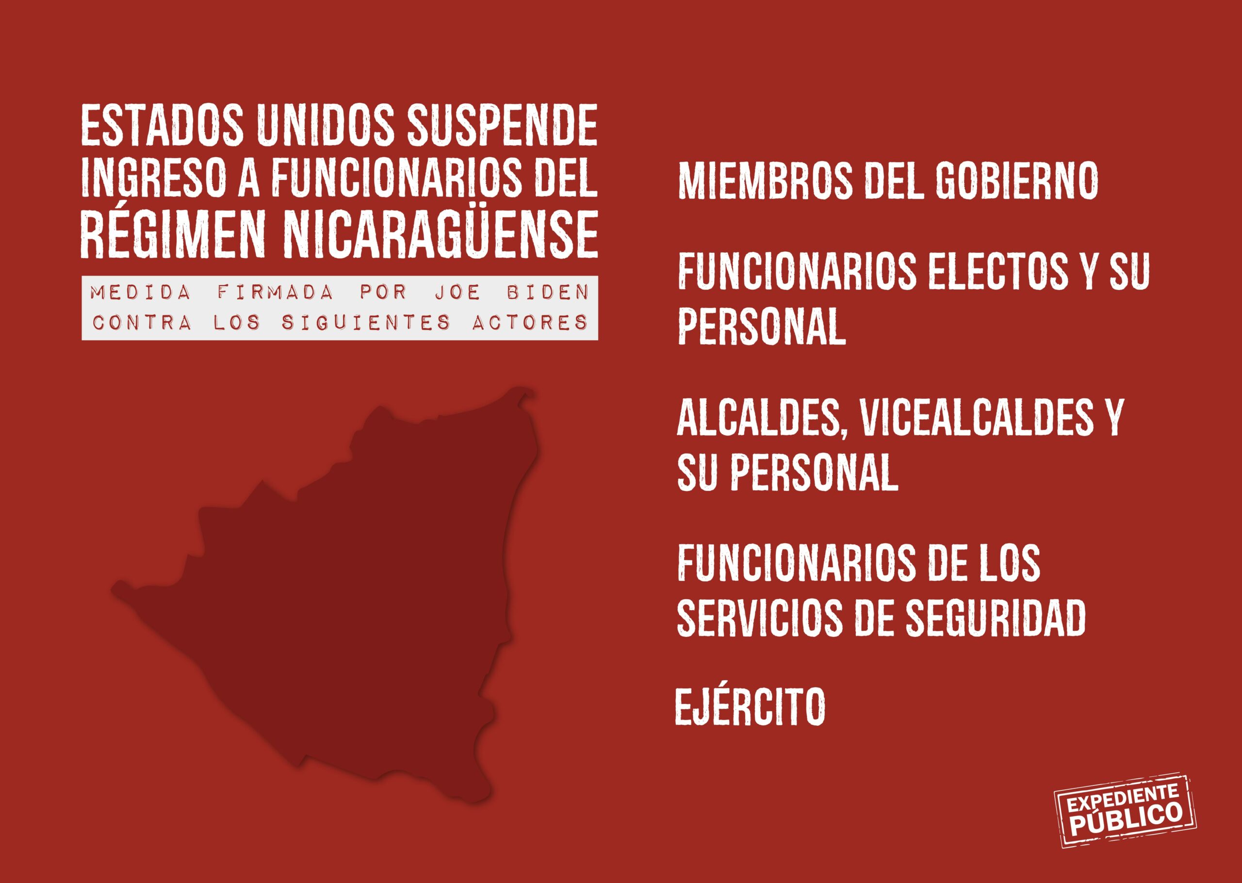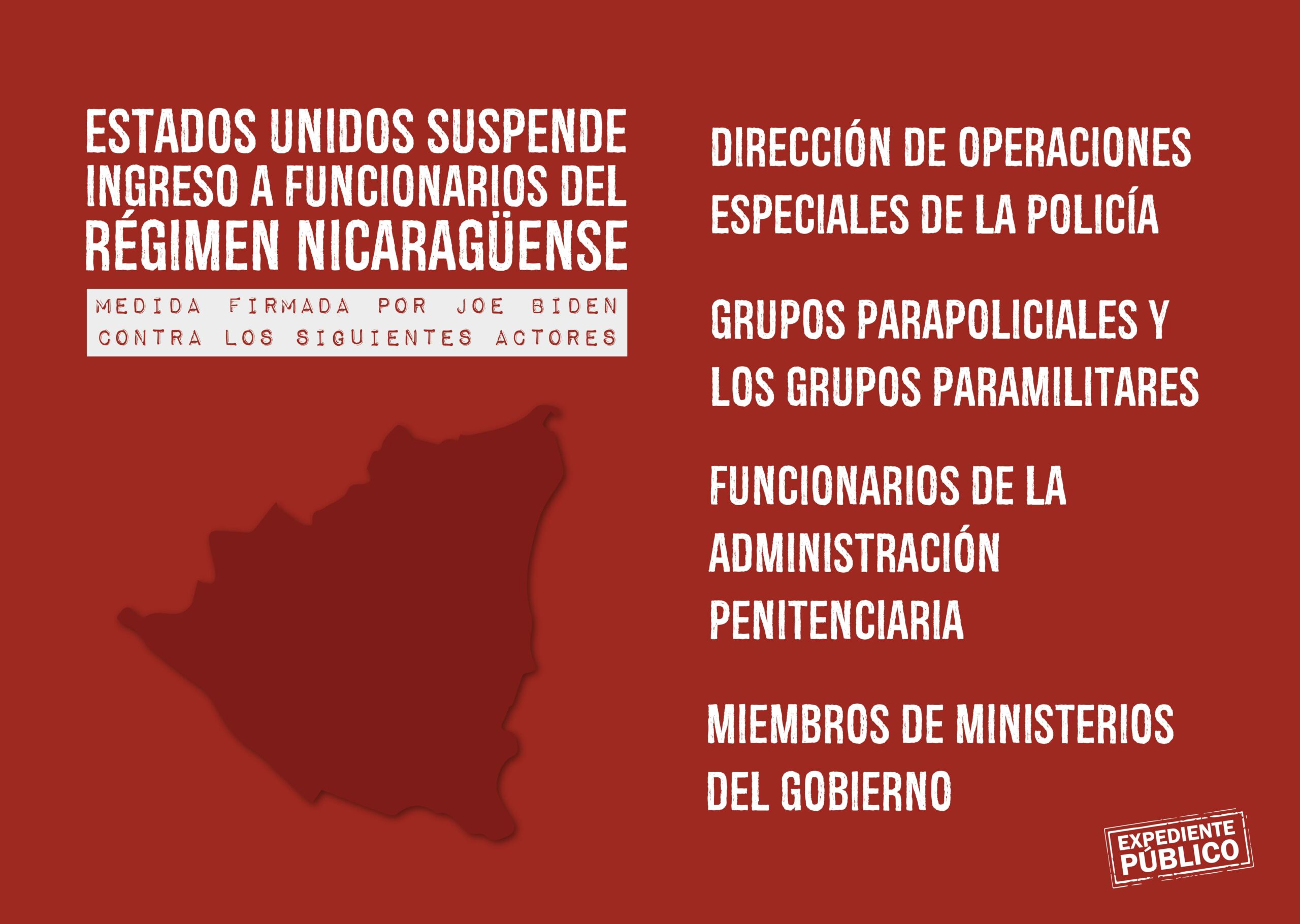 El gobierno de Biden impide el ingreso a Estados Unidos a funcionarios electos y su personal, alcaldes, vicealcaldes o secretarios políticos que “planificaron, ordenaron, asistieron, ayudaron e incitaron, cometieron o participaron de otra manera, incluso a través de la responsabilidad del mando, en abusos graves o violaciones de los derechos humanos para castigar a manifestantes pacíficos o negar las libertades fundamentales de los nicaragüenses o quien intentó o conspiró para hacerlo”.