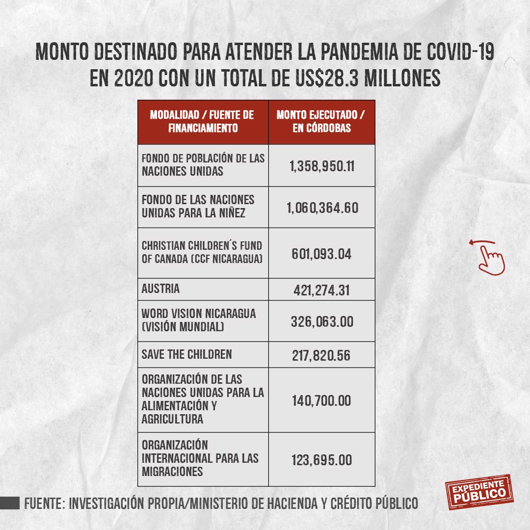 Expediente Abierto constató que, al mes de septiembre de 2021 cuando la pandemia alcanzaba un pico alto en el número de contagios en Nicaragua, que fue incluso confirmado por la Organización Panamericana de la Salud (OPS), el régimen solamente había gastado US$29 millones de los millonarios fondos disponibles, pero se desconoce en qué fueron utilizados.