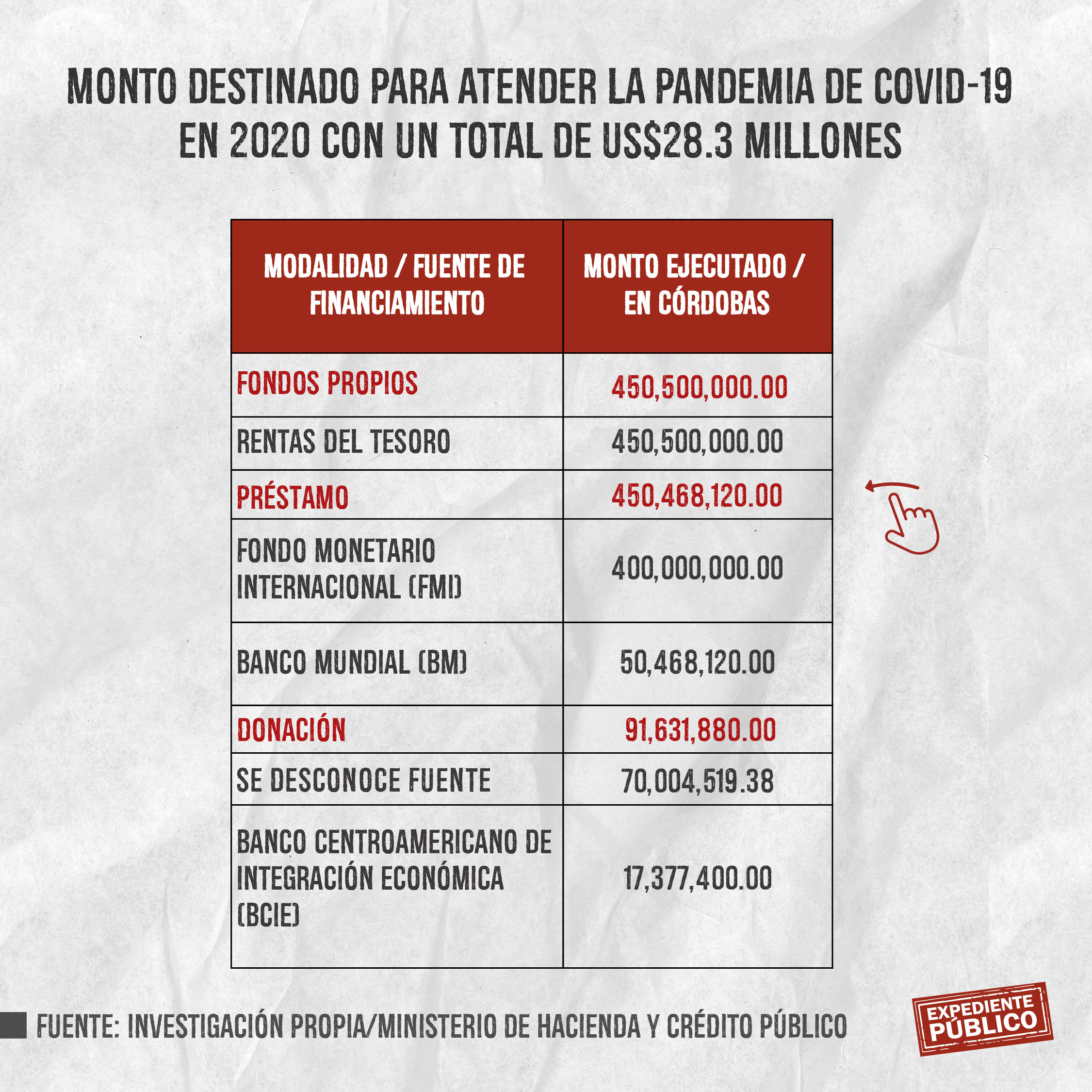 Del monto incorporado se destinaron C$4,312.3 millones (US$121.69 millones) provenientes en su mayoría de préstamos externos, que engrosaron el presupuesto para atender la pandemia en el país centroamericano con lo cual sumó C$5,014.59 millones (US$141.54 millones). El 81% de esos recursos provienen de préstamos externos, el 12% de fuentes internas y 7% donaciones.