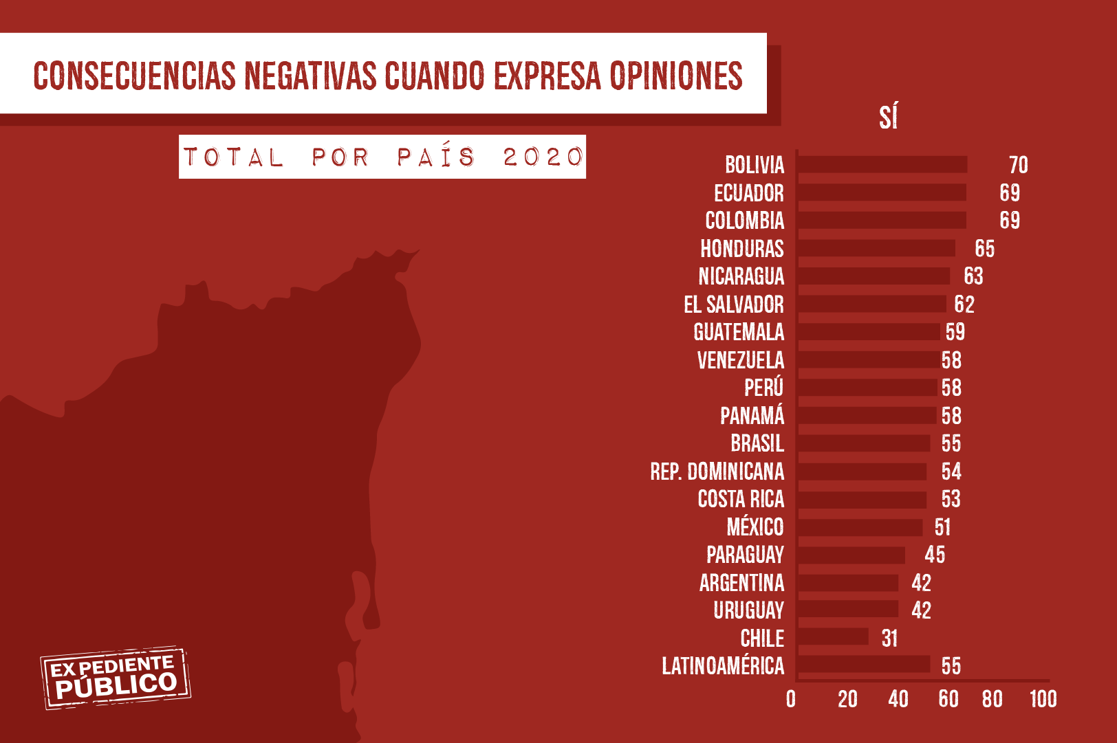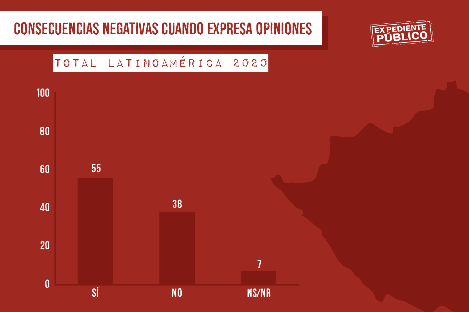 Una gran mayoría de nicaragüenses encuestados por Latinobarómetro, 63% para ser exactos, considera también que expresar sus opiniones libremente sobre los problemas del país podría traerles consecuencias negativas, ocupando la quinta posición en América Latina, después de Bolivia (70%), Ecuador (69%), Colombia (69%) y Honduras (65%).
