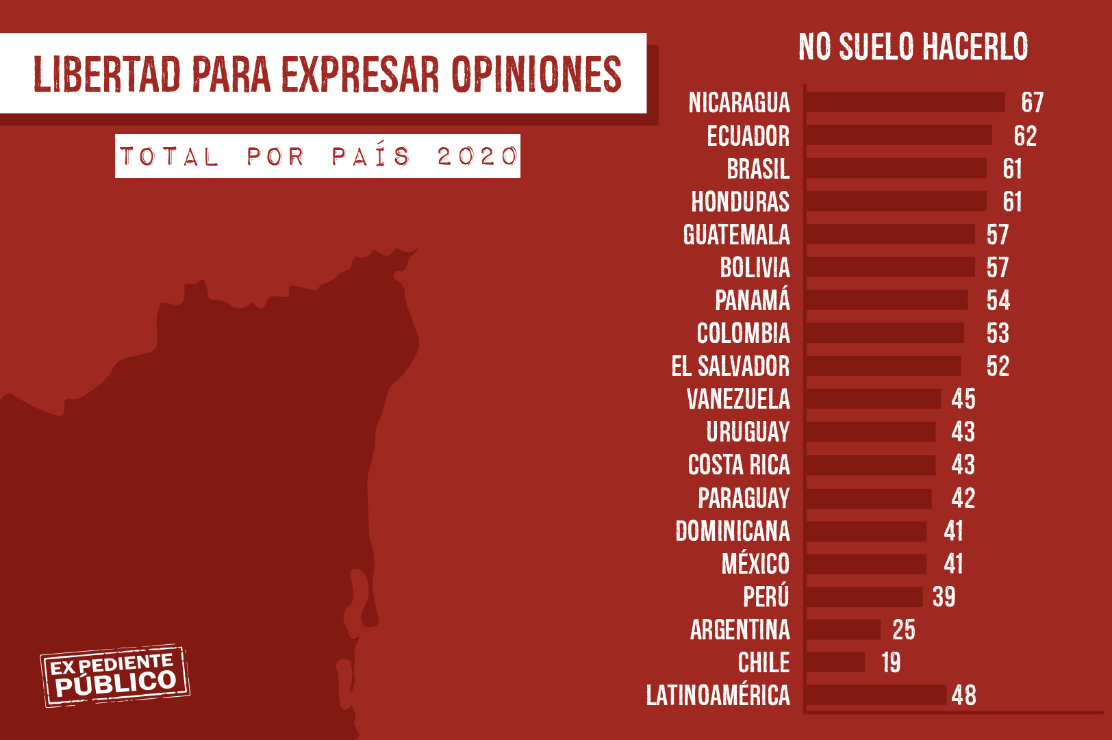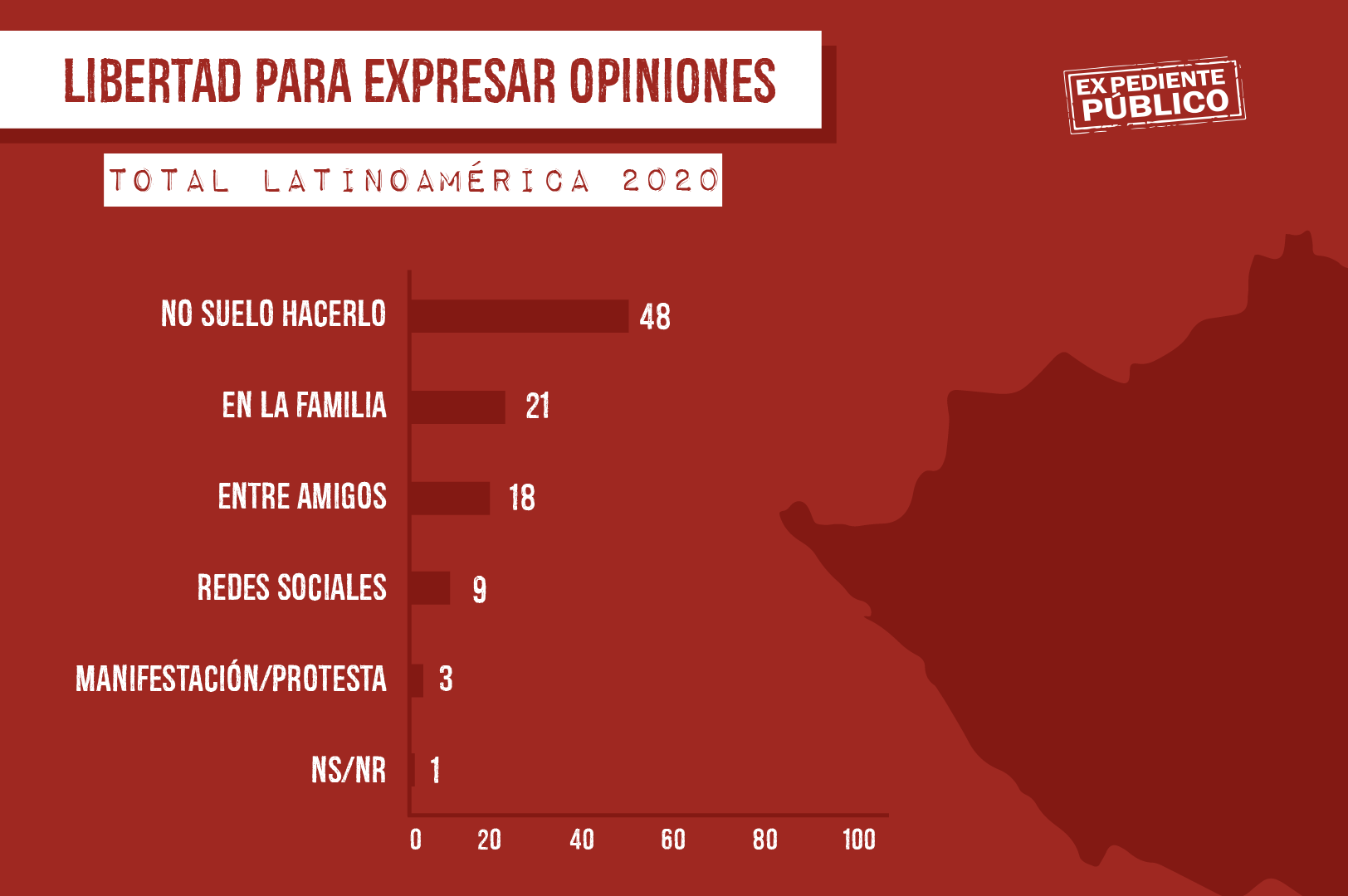 Entre los ciudadanos de 18 países de América Latina, los nicaragüenses son los que menos están dispuestos a expresar sus opiniones en público e incluso dentro de sus familias. Un 67% de los encuestados por el Latinobarómetro afirmó que no suelen expresar públicamente sus opiniones sobre los problemas del país.